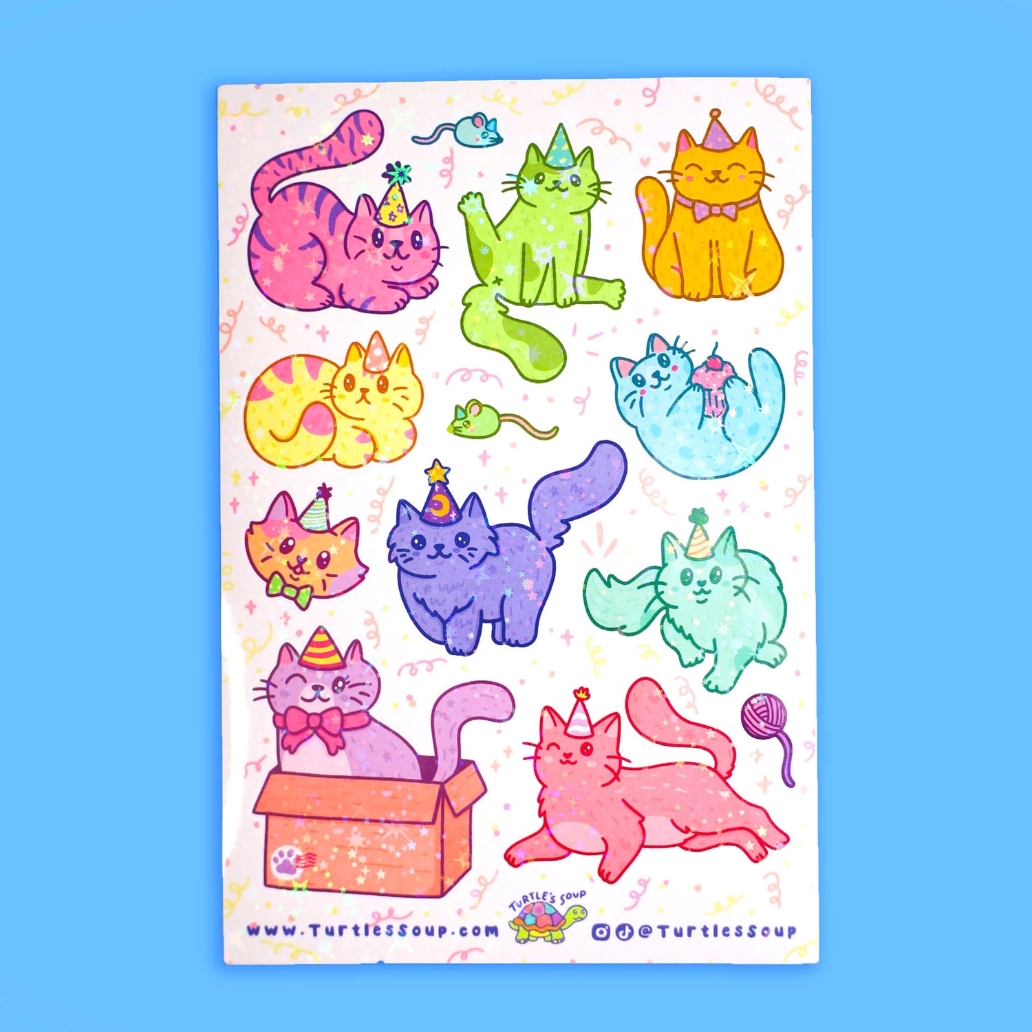 'Birthday Cats' sticker sheet by Turtle's Soup 🐢 Our Kiss Cut Sticker Sheets are 4 inches by 6 inches and include one (1) sheet per package, with 10 to 20 individual waterproof, vinyl stickers on each. 🐢 Each sheet is enclosed in a sleeve with an art backing card and are retail-ready! 🐢 Stick them on water bottles, laptops, cars, coolers, helmets, skateboards, or just about any flat surface you can think of.
