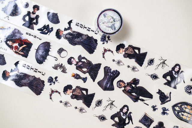 Step into the world of Victorian elegance with this unique transparent PET tape by CoraCreaCrafts. Designed with an intricate mix of gothic-inspired stickers, this tape features a 100cm repeat loop, showcasing a variety of detailed designs. The glossy finish adds a sophisticated shine, making it perfect for adding a touch of vintage charm to your creative projects.