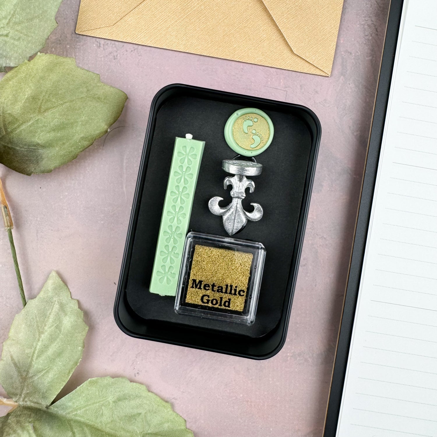 Includes 3/4" seal, light green wax, and gold stamp pad.