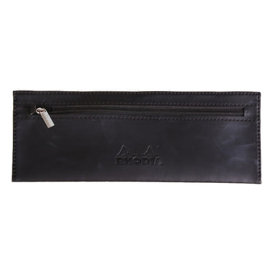 Smooth black leather pencil case with metallic zipper and embossed Rhodia logo.