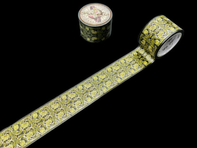 A unique washi tape featuring a foresty/floral pattern with elvish and magical vibes. The design includes beautiful silver foil details. This washi tape was designed by Storm Sparrow for CoraCreaCrafts.