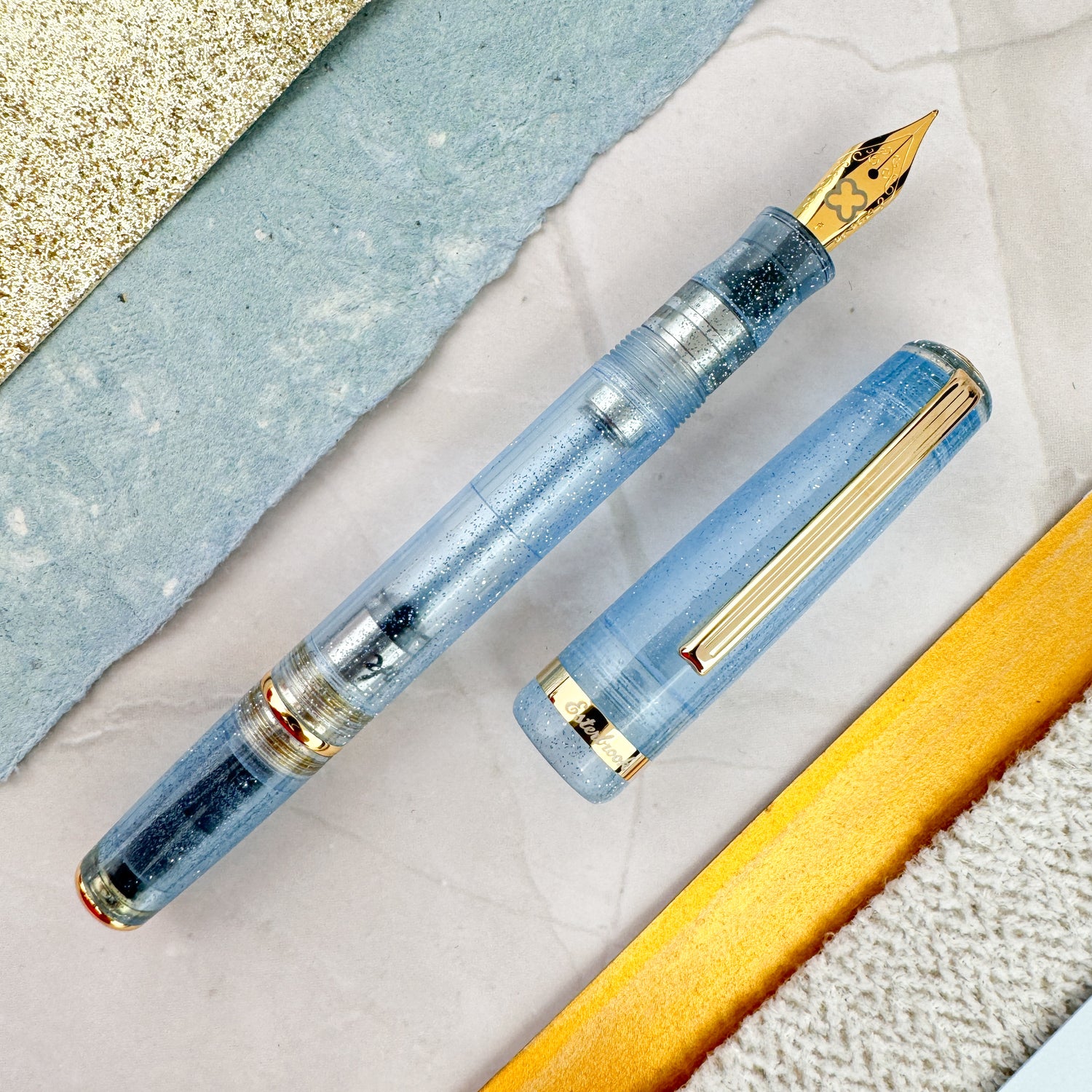 Twinkle is a light blue fountain pen with a frosted, semi-translucent finish and subtle shimmering sparkles. The gold trim provides a classic contrast, enhancing its refined look. Its cool, icy tone is both eye-catching and elegant. Featuring a comfortable size and balanced design, Twinkle is a stylish and functional choice for any writing collection, whether for daily use or display.