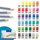 Contents Include: 36 Watercolor Pencils: #101 White, #104 Light Yellow Glaze, #105 Light Cadmium Yellow, #107 Cadmium Yellow, #109 Dark Chrome Yellow, #115 Dark Cadmium Orange, #118 Scarlet Red, #121 Pale Geranium Lake, #126 PermanentCarmine, #130 Salmon, #131 Coral, #125 Middle Purple Pink, #133 Magenta, #136 Purple Violet, #137 Blue Violet, #151 Helioblue-Reddish, #143 Cobalt Blue, #120 Ultramarine, #140 Light Ultramarine, #147 Light Blue, #153 Cobalt Turquoise #156 Cobalt Green, #161 Phthalo Green, #163 Emerald Green, #166 Grass Green, #170 May Green, #167 Permanent Green Olive, #173 Olive Green Yellowish, #187 Burnt Ochre, #192 Indian Red, #176 van Dyck Brown, #273 Warm Grey IV, #233 Cold Grey IV, #199 Black, #250 Gold, and #251 Silver in a metal tin
