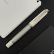 The striped barrel is made of cellulose acetate. The characteristic double rings at the back of the barrel and on the cap are integrated into the material. This is done with the highest precision in order to obtain a virtual seamless transition between the materials. The completely rhodinized 14 carat gold nib matches the silver sheen of the other components. Even the silver-white barrel of the fountain pen and the upper-part of the ballpoint pen harmonize perfectly with the silver-white look.