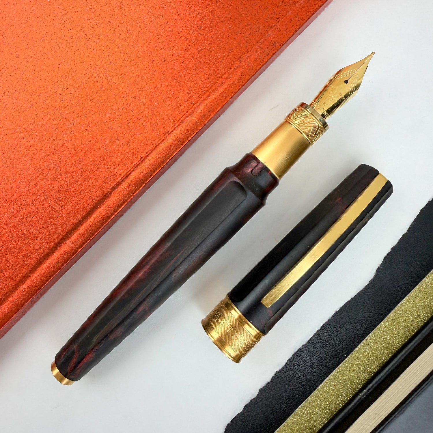 The Mythos collection is a tribute to the ancient Greek gods, who inspired art, literature and culture for centuries. Mirage Mythos Hades draws inspiration from the Underworld itself. It is a writing instrument for leaders, visionaries, and keepers of legacy for those who rule without needing to be seen. Hades transforms darkness into pure sophistication. Emerging from this depth, the gold trim and nib introduce a regal, restrained brilliance like precious light surfacing on hidden treasure. An intense black resin, shot through with fiery red streaks, evokes the rivers of fire and shadowed depths of the Underworld.