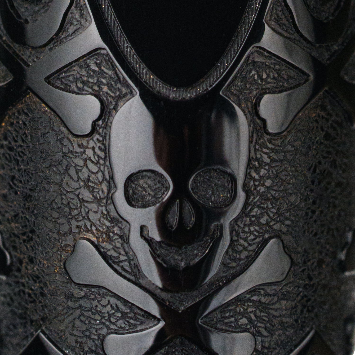 Crafted in deep black resin and crowned with a sculpted skull emblem on the cap, this pen channels pirate lore with striking elegance. The intricately etched body evokes charred earth and forgotten tales, conjuring a sense of weathered mystery with every line
