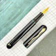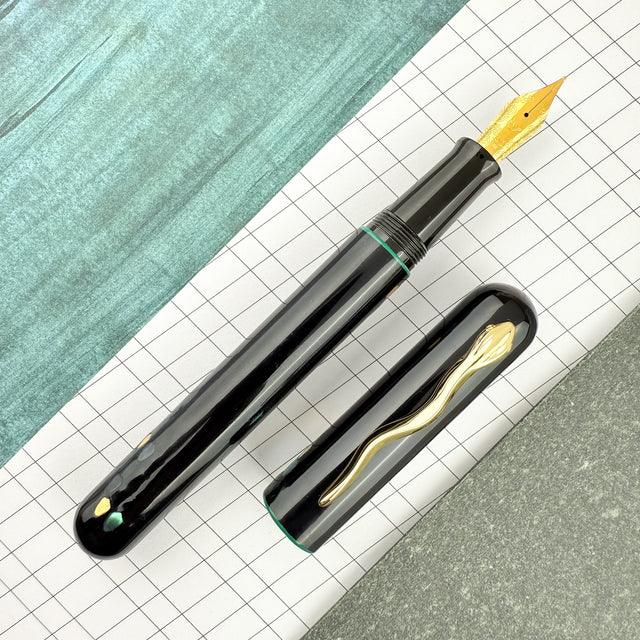 This is not just a pen—it’s a statement. Featuring a mesmerizing Green Tamenuri with spiraling Raden and a sterling silver clip, this piece is limited to only 25 copies. Each pen is individually numbered with a golden, hand-written number on the barrel, making it a truly rare collectible. This pen boasts an Ebonite feed and a14k Gold nib for a writing experience that is as smooth as it is inspiring.