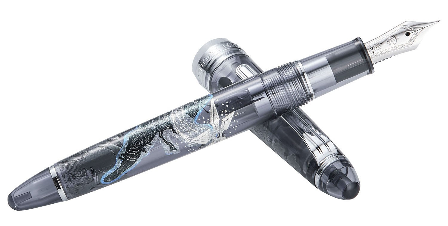 Star: This pen has a transparent dark grey body and a 14K gold nib with rhodium plating. This design is based on the shuriken, or throwing stars, which were used to create noise and instill fear in enemies.