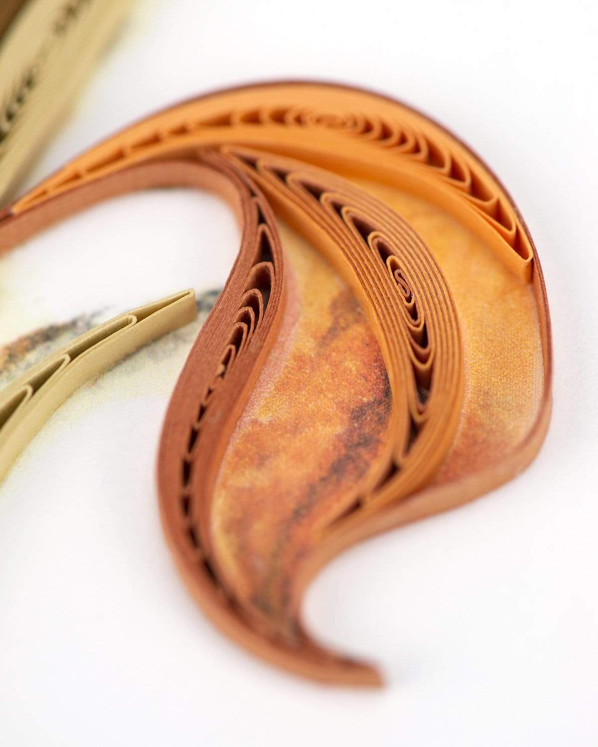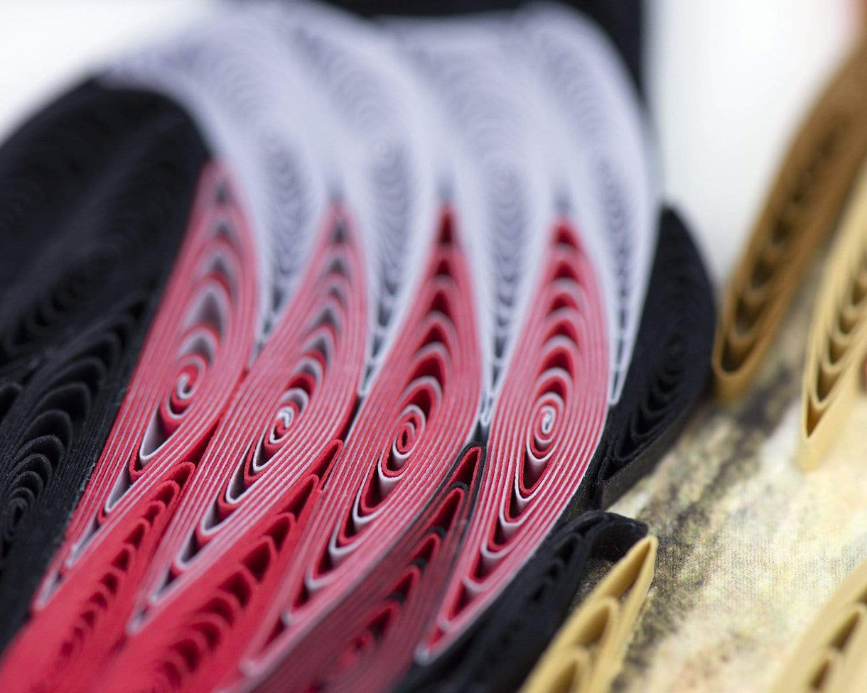 Send a unique quilled Woodpecker greeting card to a bird lover or history buff in your life! Lewis's woodpecker is a large North American species of woodpecker which ornithologist Alexander Wilson named after Meriwether Lewis, one of the explorers who surveyed the areas bought by the United States of America as part of the Louisiana Purchase and discovered this species of bird. The handcrafted design depicts the red, gray and black woodpecker perched on a vertical tree trunk with orange leaves.