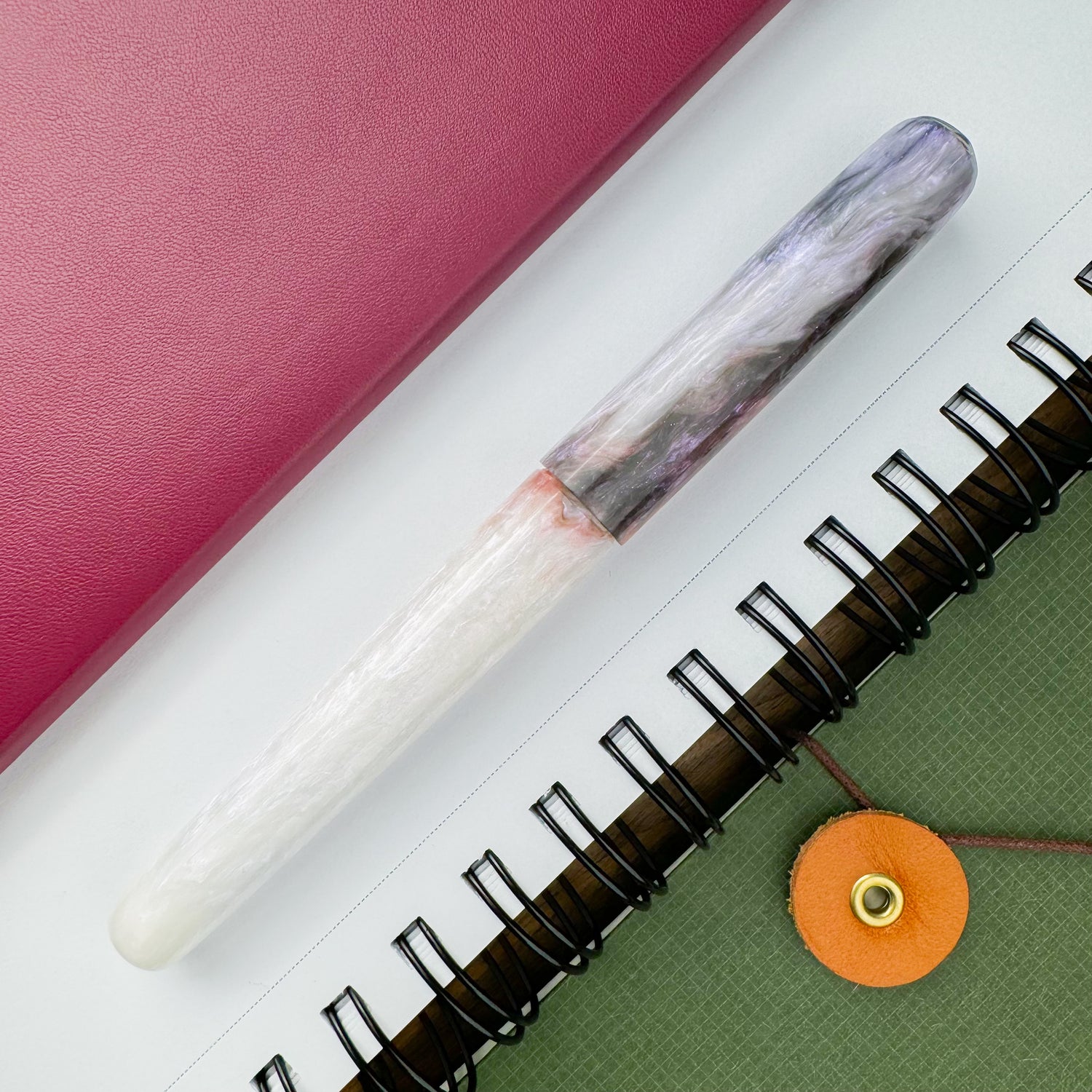 The Hinze Pen Co. F24 "Luna White Hibiscus" Fountain Pen is a graceful tribute to Florida’s native flower. Its resin barrel blends pristine white and soft purple, capturing the delicate beauty of the Luna White Hibiscus in full bloom. The pen is further elevated by electroplated colored clips and nibs, adding a refined touch of elegance. Ideal for those who appreciate both nature and craftsmanship, the "Luna White Hibiscus" offers a perfect balance of beauty and performance, making it a standout piece in any collection.