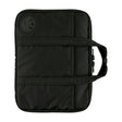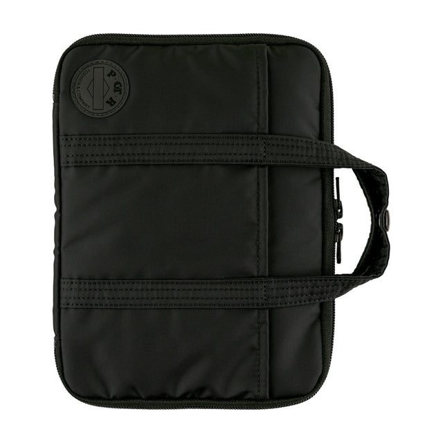 The Cousin size is black. It has a sharp, crisp look and is a signature color of Yoshida & Co. The attached shoulder straps make it easy to carry around. Once you open the zipper, you will find that the lining is in a combination of black and navy. The left side includes three card pockets, as well as a clear pocket big enough to fit your passport. This design is reminiscent of a small bag and was created with POTR.