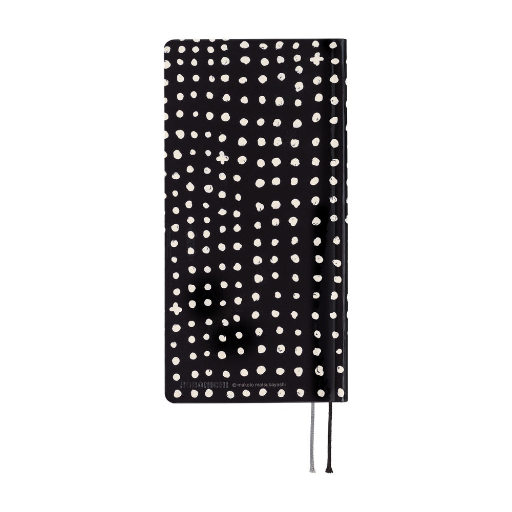 A techo cover made using a drawing by printmaker and artist Makoto Matsubayashi. White dots painted leisurely on a black background. While this is a clean and simple design, the rough patches and movements that can only be achieved by drawing by hand exude a particular gentleness. The tiny flowers set into the dots is another thing to look out for. The cover has been constructed as a light hardcover book with some give to it so it still bends.