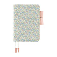 A small floral pattern reminiscent of the pastoral illustrations by picture book author Kate Greenaway. Pink and light blue anemones flutter gently, while small buds and leaves create a rich design that evokes a meadow swaying in the breeze. The inside is a pale pink. This is a cover where both cuteness and sophistication are balanced. It has "butterfly stopper" pen holders, which also function as a clasp to keep the cover shut.