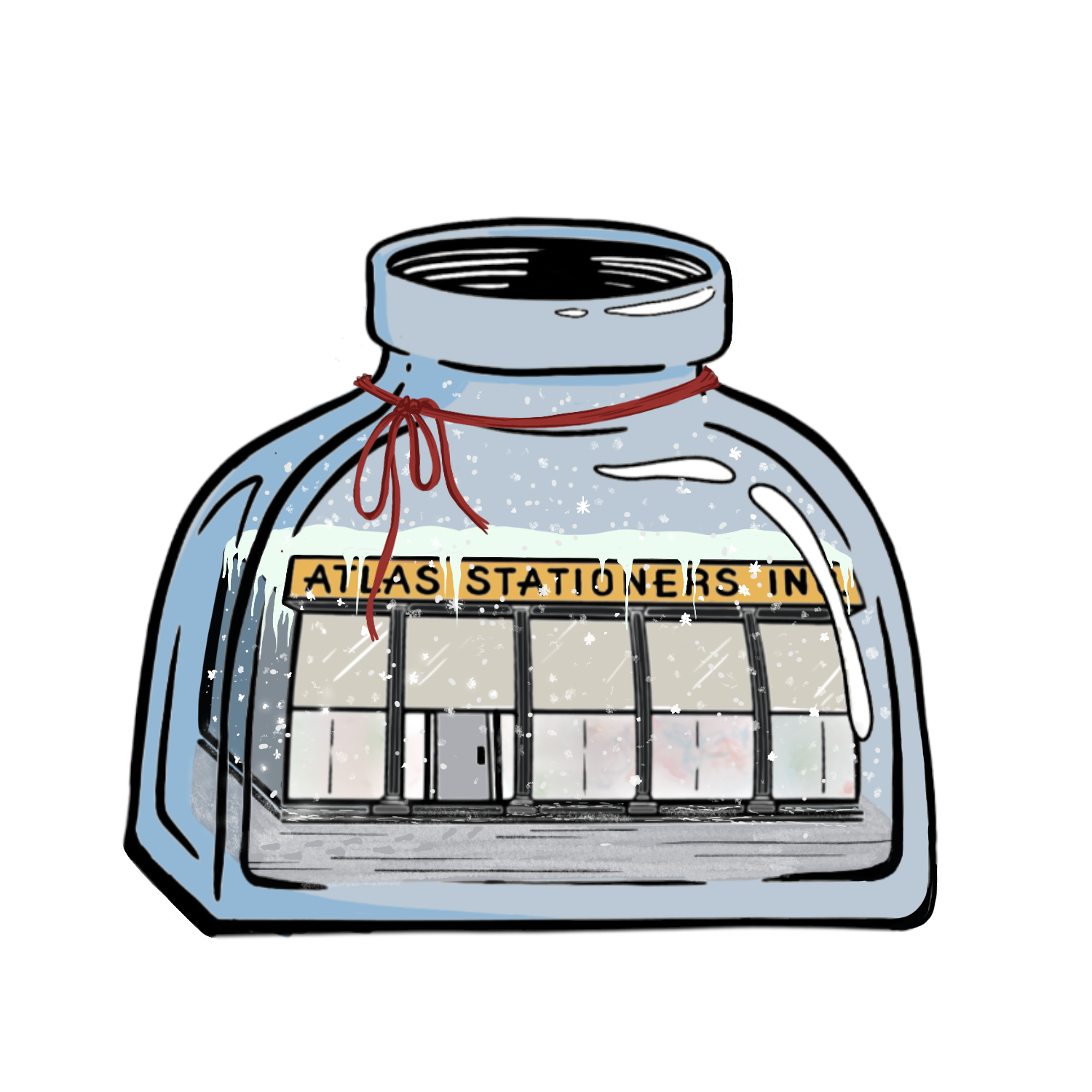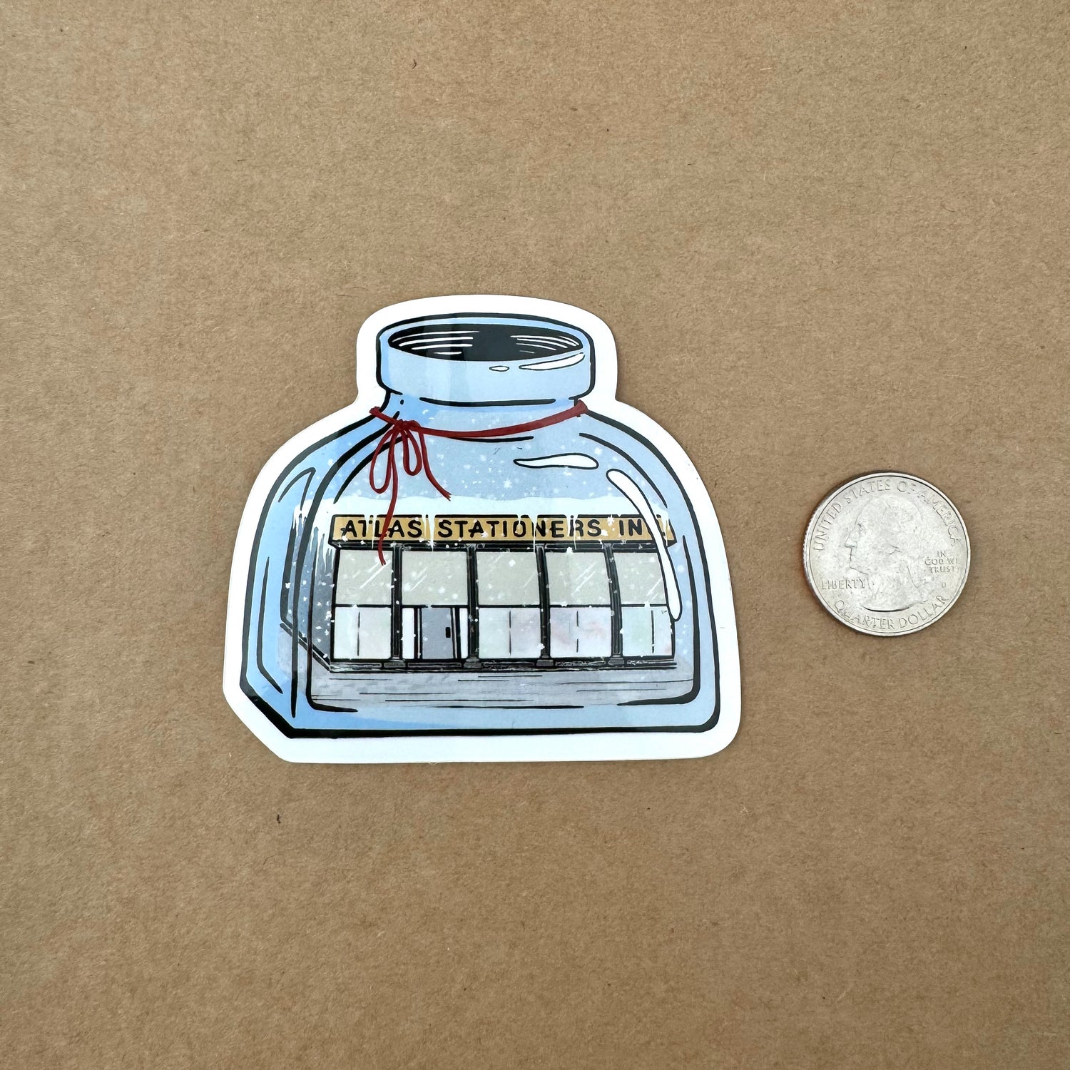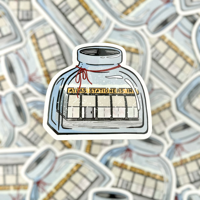 Exclusive Atlas Stationers 'Atlas Ink Bottle' sticker with the Atlas storefront inside of an ink bottle.