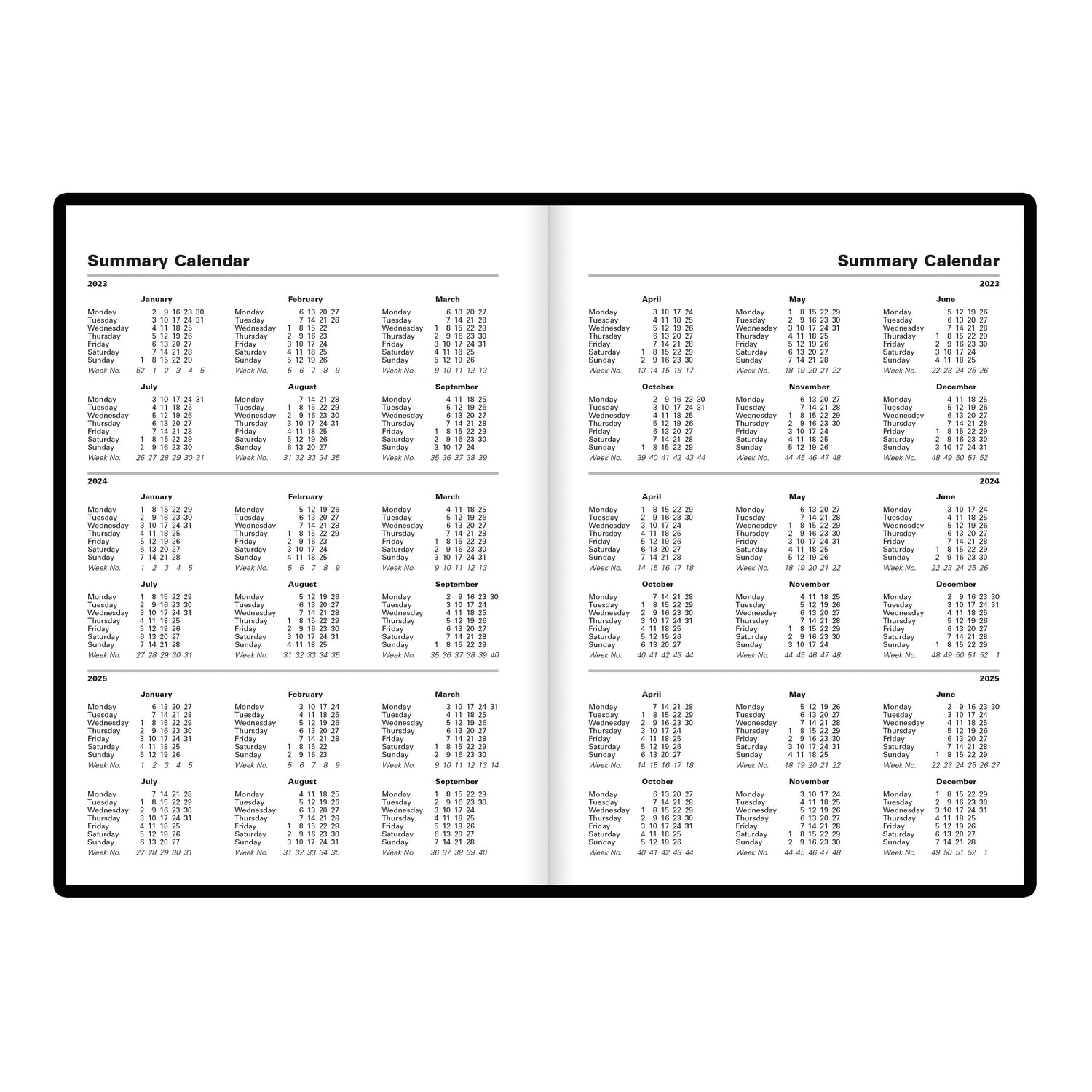 A classic hardback diary with leather-look finish and deluxe foil embossing. Features day per page diary with feint ruled areas for entries. Includes calendars of current and followings months on each spread to plan future tasks. Includes a ribbon bookmark, a monthly expense section, ruled notes section, personal information, holiday symbols, national holidays, religious festivals, conversion tables and many more.