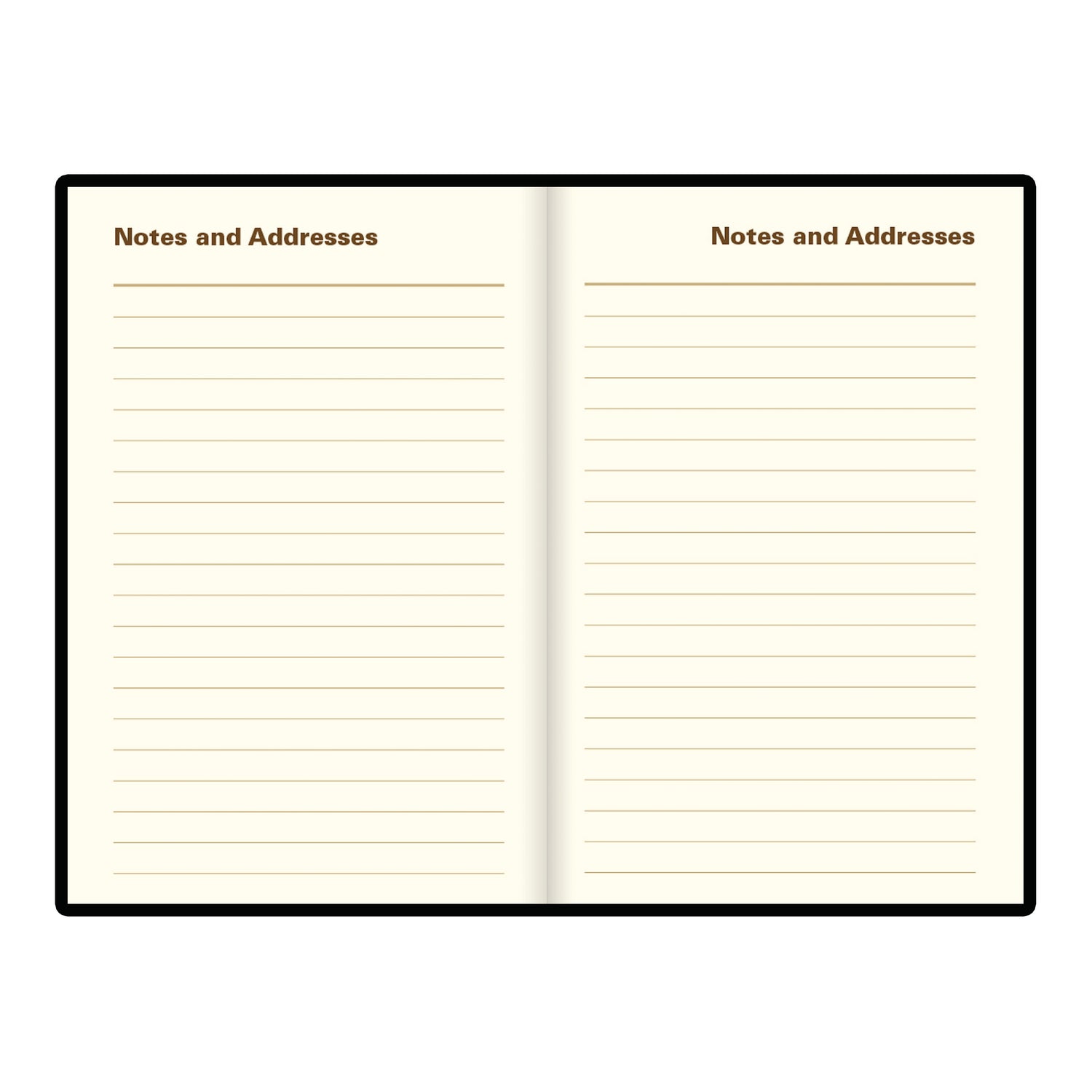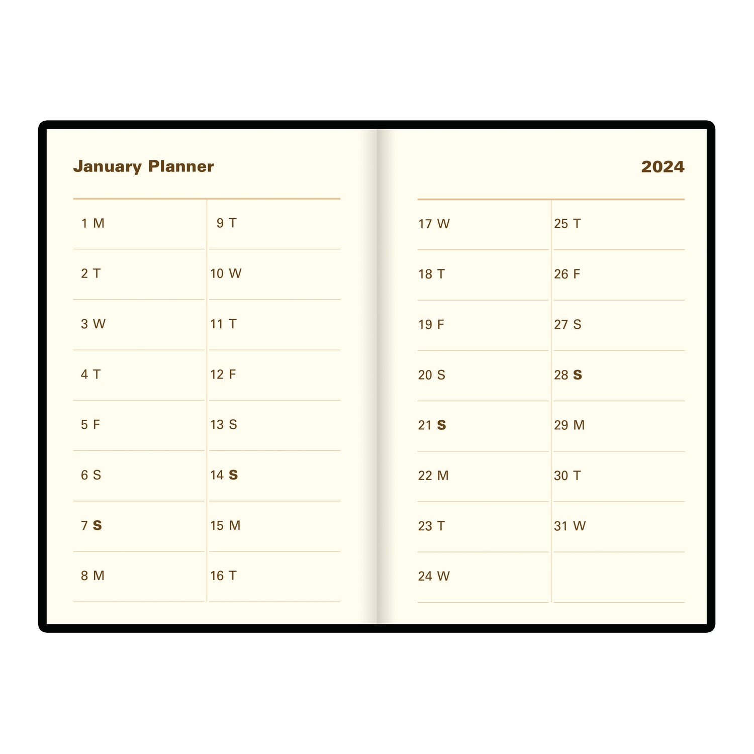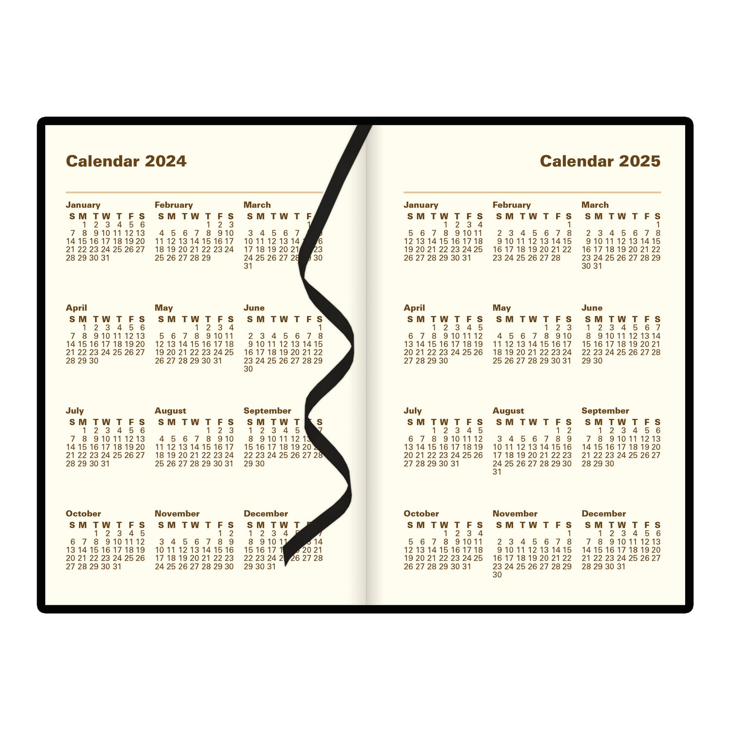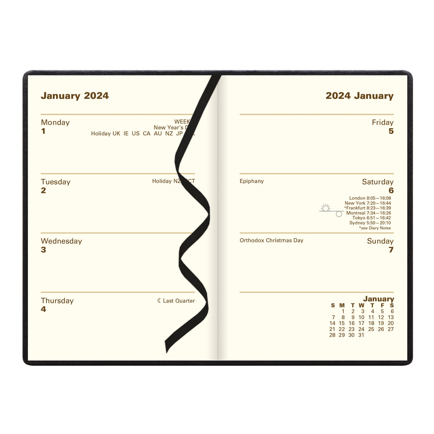 A soft-grained leather diary with gilded page edges and ribbon bookmark. Features a week to view planner with vintage cream-colored paper, calendar of current month on each spread and a monthly planner before each month. Includes a pocket on the inside of cover, ruled notes section, personal information, holiday symbols, national holidays, religious festivals, conversion tables and many more. Comes in gift box.