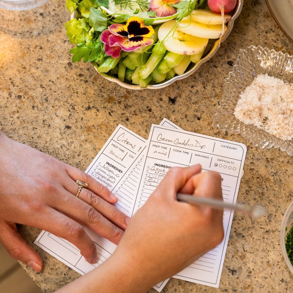 Each 4 x 6 inch recipe card has space for ingredients and directions, as well as details like serving size, prep time, cook time, and difficulty rating. The back of each card has space for notes, a visual of the finished product, and the story of where the recipe came from.