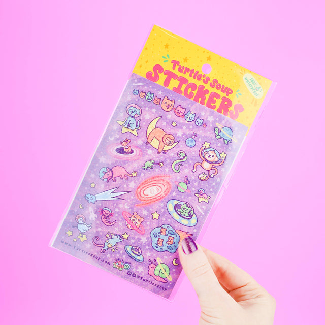 Cosmic Critters' sticker sheet by Turtle's Soup 🐢 Our Kiss Cut Sticker Sheets are 4 inches by 6 inches and include one (1) sheet per package, with 10 to 20 individual waterproof, vinyl stickers on each. 🐢Each sheet is enclosed in a sleeve with an art backing card and are retail-ready! 🐢Stick them on water bottles, laptops, cars, coolers, helmets, skateboards, or just about any flat surface you can think of.