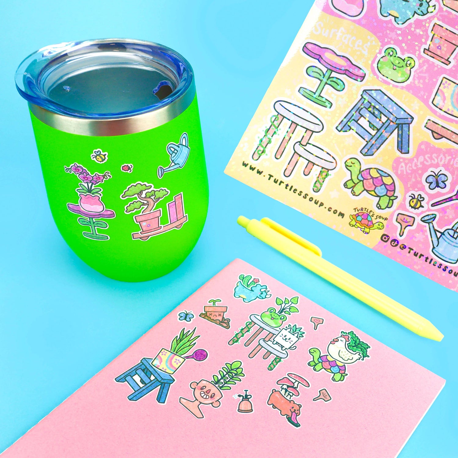 'Make your own planter garden' sticker sheet by Turtle's Soup 🐢 Our Kiss Cut Sticker Sheets are 4 inches by 6 inches and include one (1) sheet per package, with 10 to 20 individual waterproof, vinyl stickers on each. 🐢 Each sheet is enclosed in a sleeve with an art backing card and are retail-ready! 🐢 Stick them on water bottles, laptops, cars, coolers, helmets, skateboards, or just about any flat surface you can think of.