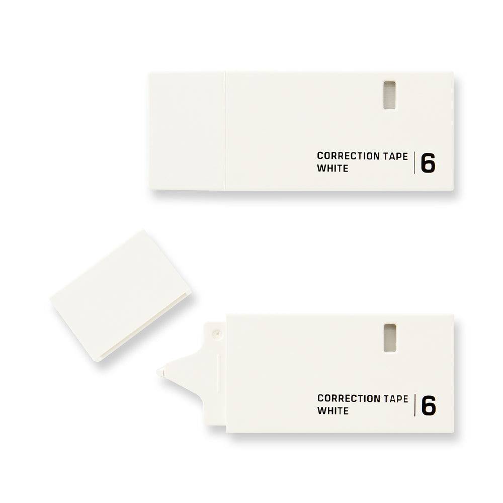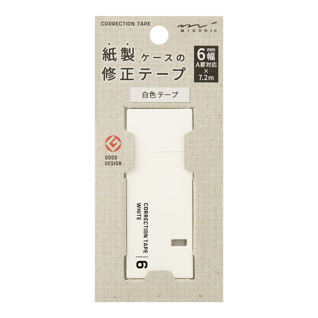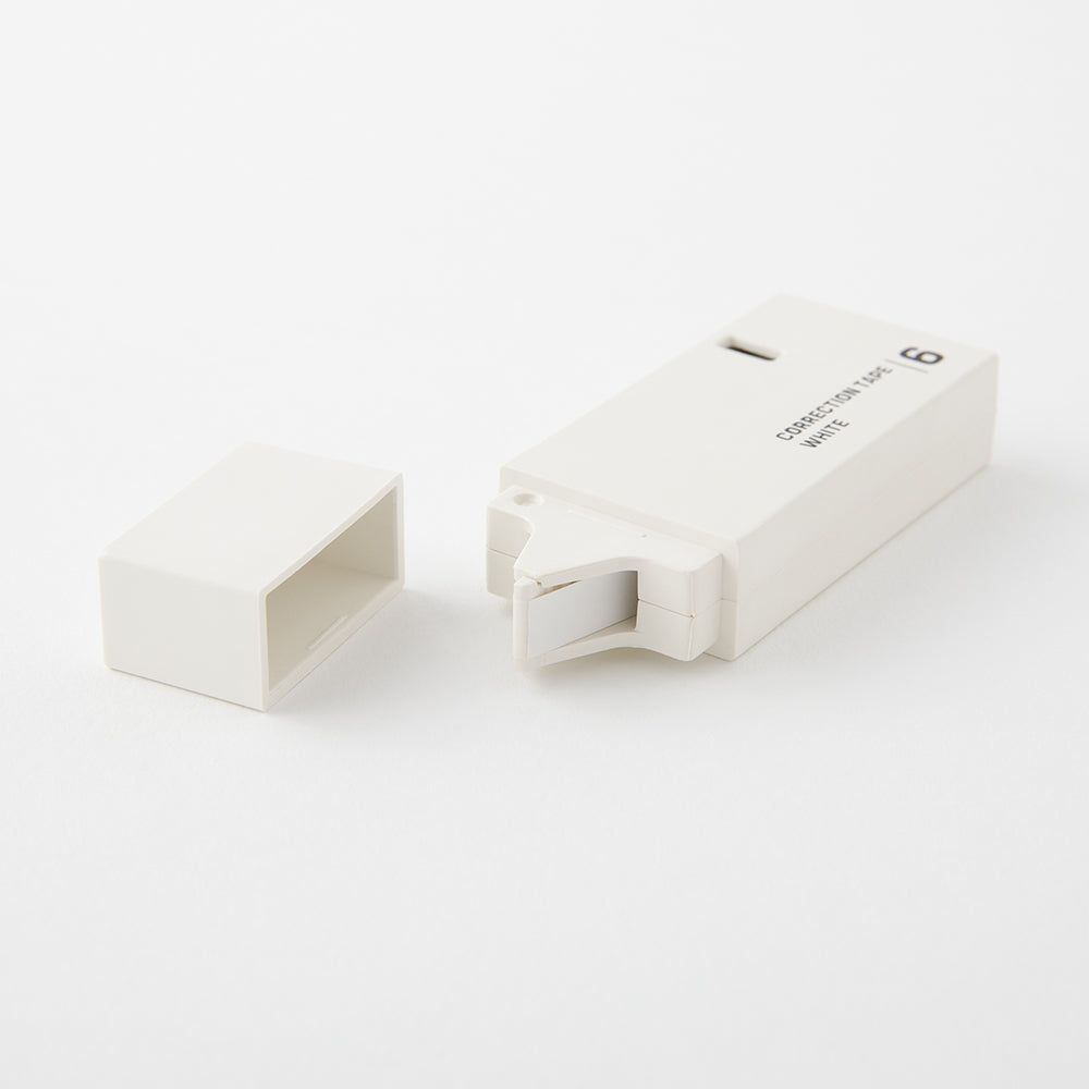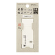 This sustainable correction tape replaces all plastic parts such as the case, internal structure, and release film with biomass materials (51% paper + 49% PP) and paper, which can be disposed of as burnable waste. The color of the tape is white to match the white paper, and it is 6mm wide to fit a typical 7mm wide horizontally ruled notebook.