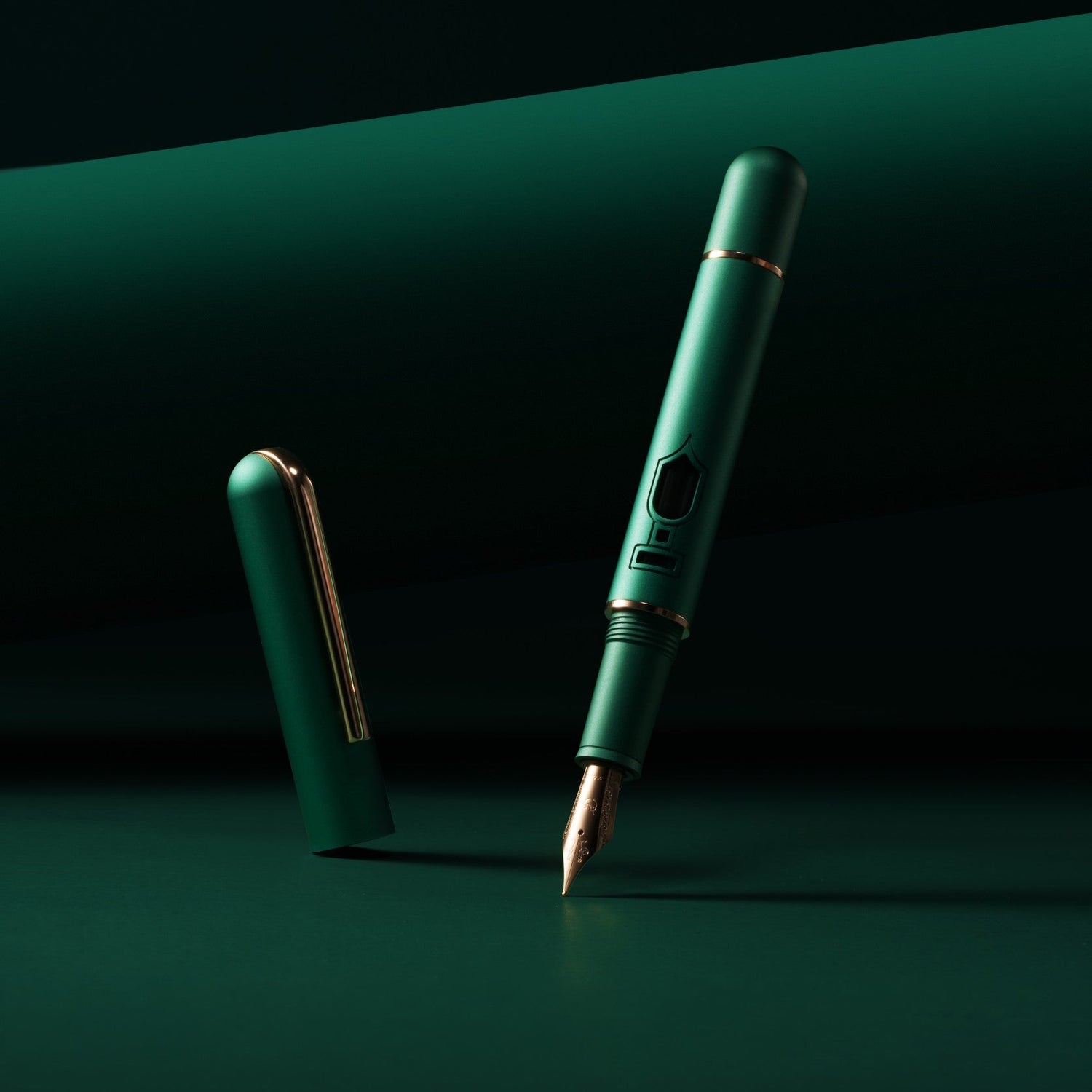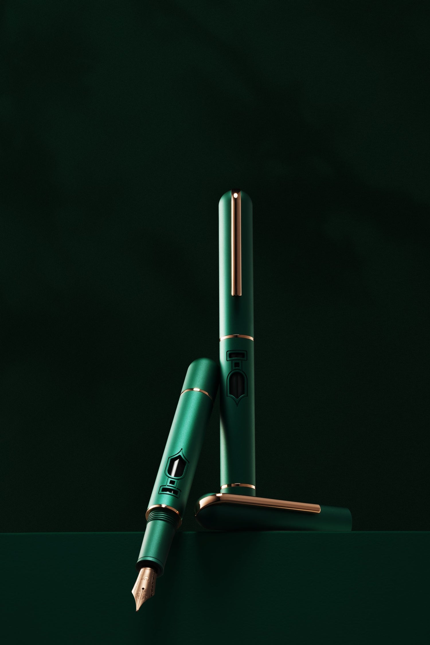 Crafted from anodized aluminum in the official emerald green, this elegant limited edition features rose gold trims and a modern twist on Nahvalur’s iconic Nautilus ink window.