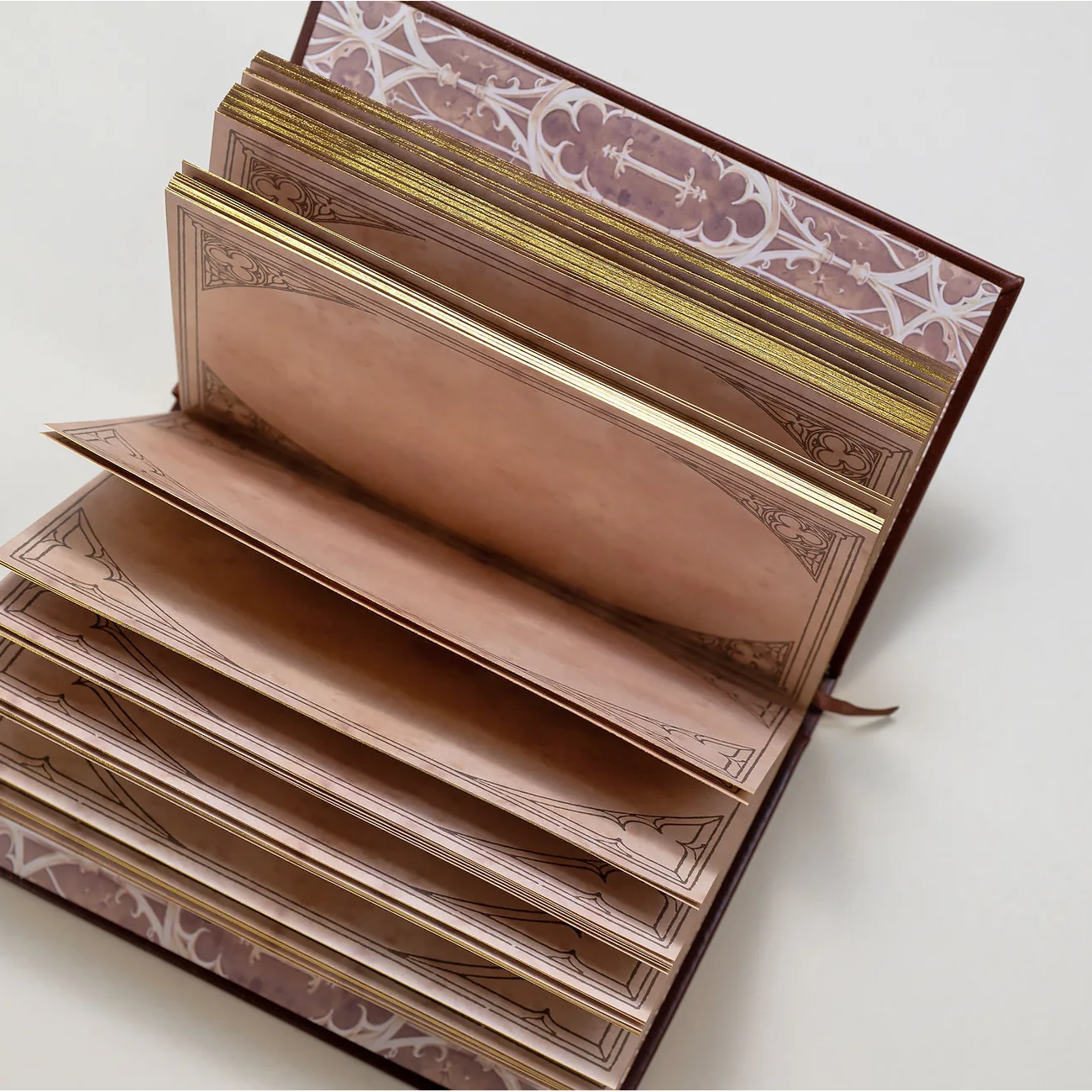 -Hardcover with gold-foiled and embossed designs on the front, spine and back
