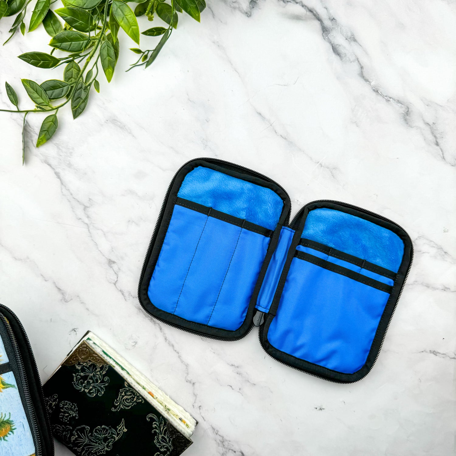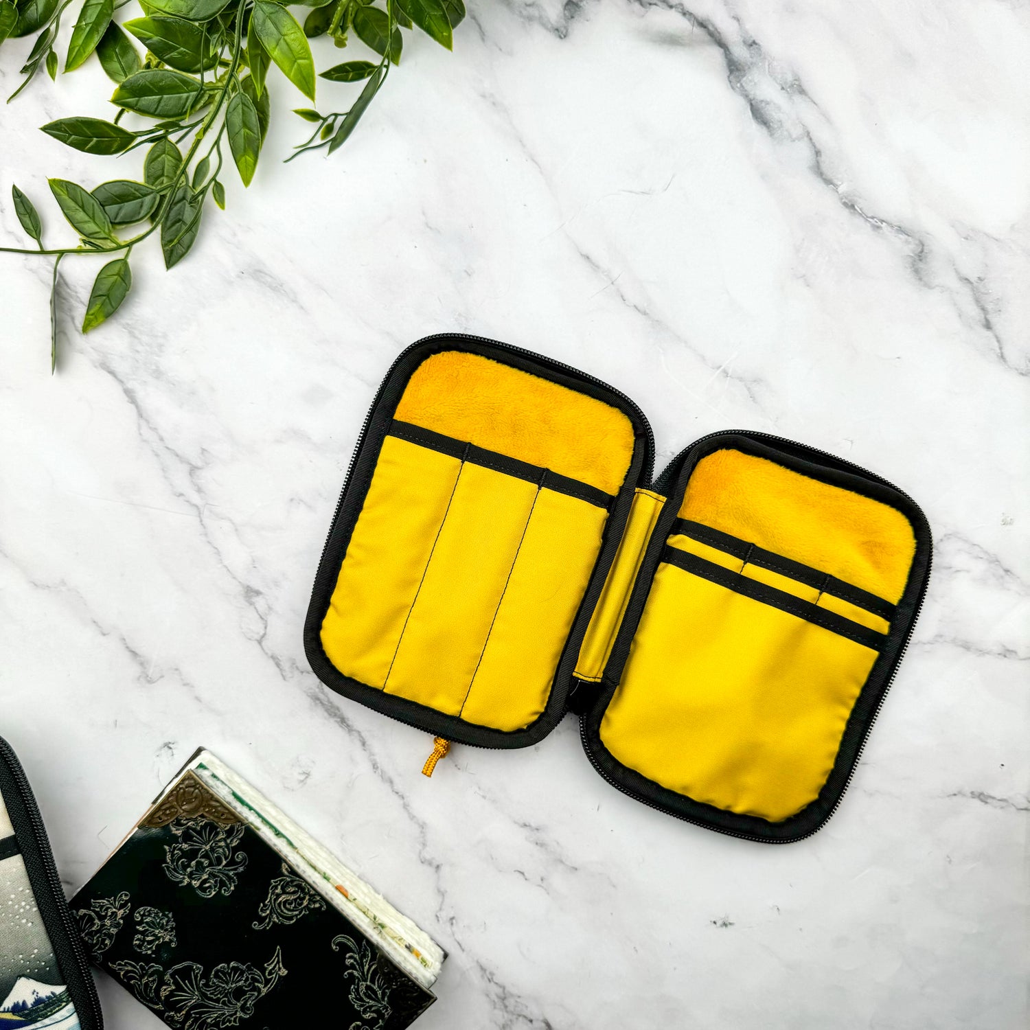 Our new Fillmore Pen Case opens like a book. The front and back panels are lightly padded, and the interior is lined with our super-soft Royal Plush lining. The Fillmore is available with two internal configurations. For the notetaker, the 3-pen version features three individual pen slots on the left side, and a full-width pocket on the right side, for stowing a pocket-size journal, plus two credit card slots. For the pen collector, the 3+3 version has three pen slots on both sides, plus a full-width slip pocket on the right side for stowing a 2-Pen Coozy (Size L, or smaller, sold separately) or a pocket notebook.