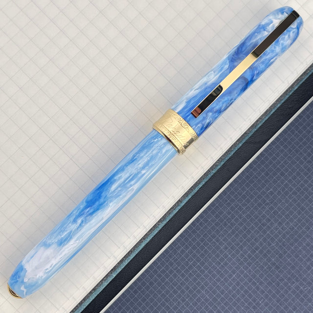 Each pen features special trims and colored resins designed specifically to express the imagery particular to each of Dante's realms. The Inferno (Hell) is made of solid black resin with flaming-red accents and dark ruthenium trims, evoking the fire and darkness of the Inferno. Purgatorio (Purgatory) is equipped with palladium trims, while the resin is taupe-brown as the purgatorial mountain with greyish shades representing the purifying journey of the souls. Finally, Paradiso (Heaven) is a celestial sky-blue with yellow gold trim, symbolizing the holy light and joyful nobility of paradise.