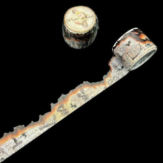 A unique vintage style washi tape designed by CoraCreaCrafts. It features a manuscript style paper with die cut burnt edges.