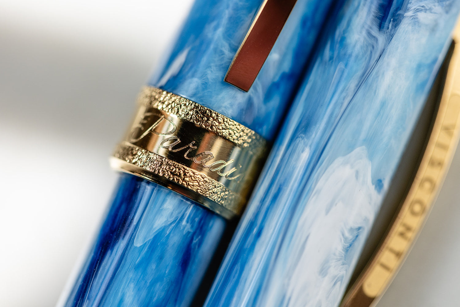 Each pen features special trims and colored resins designed specifically to express the imagery particular to each of Dante's realms. The Inferno (Hell) is made of solid black resin with flaming-red accents and dark ruthenium trims, evoking the fire and darkness of the Inferno. Purgatorio (Purgatory) is equipped with palladium trims, while the resin is taupe-brown as the purgatorial mountain with greyish shades representing the purifying journey of the souls. Finally, Paradiso (Heaven) is a celestial sky-blue with yellow gold trim, symbolizing the holy light and joyful nobility of paradise.