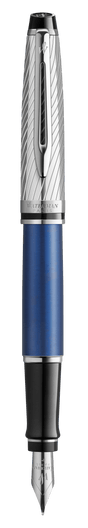 The Expert Deluxe Blue Fountain Pen barrel’s tapered silhouette and cap’s laser-engraved, contoured stripe pattern allow individuals to showcase their superior taste. The metallic, blue lacquer barrel, signature Waterman double-branched clip and beveled cap combine seamlessly with the elegant, looped W of the stainless-steel nib.