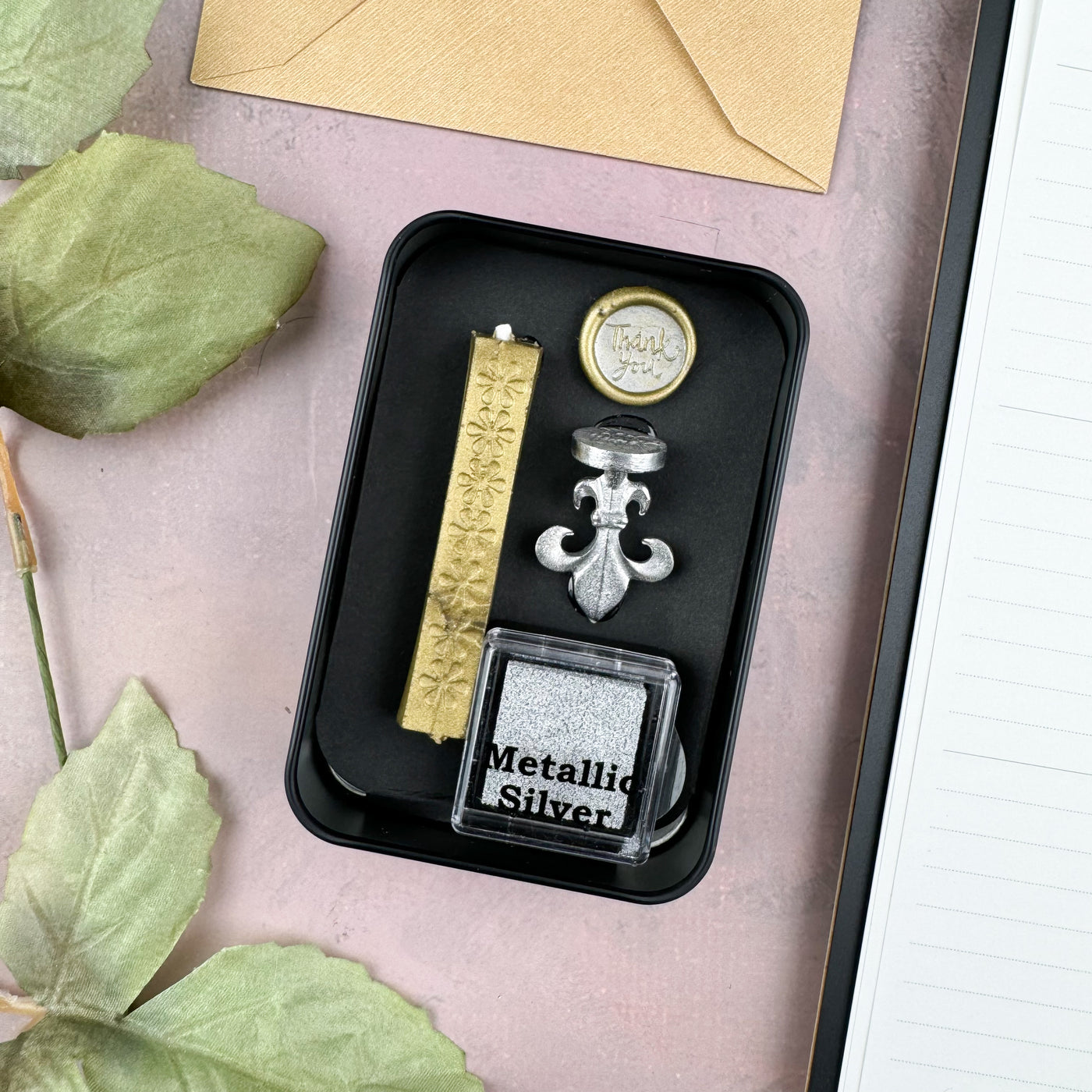 Includes 3/4" seal, gold wax, and silver stamp pad.