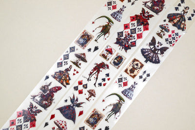 Step into the world of Alice's Wonderland with this unique transparent PET tape by CoraCreaCrafts. Designed with an intricate mix of dark Wonderland-inspired stickers and vintage Queen of Hearts styles. This tape is 5cm wide with a 100cm repeat loop making it 5m long, precut designs (like stickers), showcasing a variety of detailed designs.