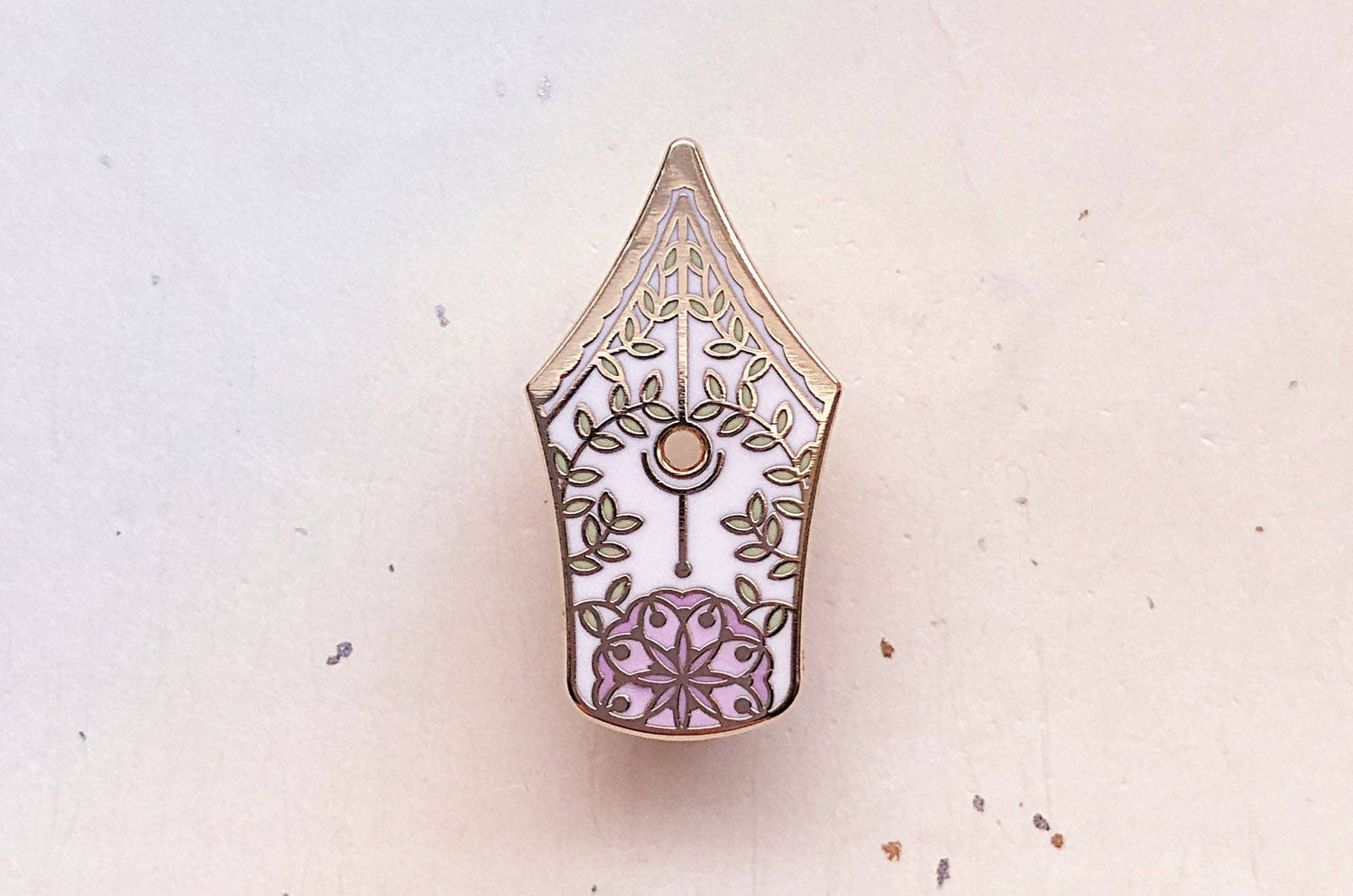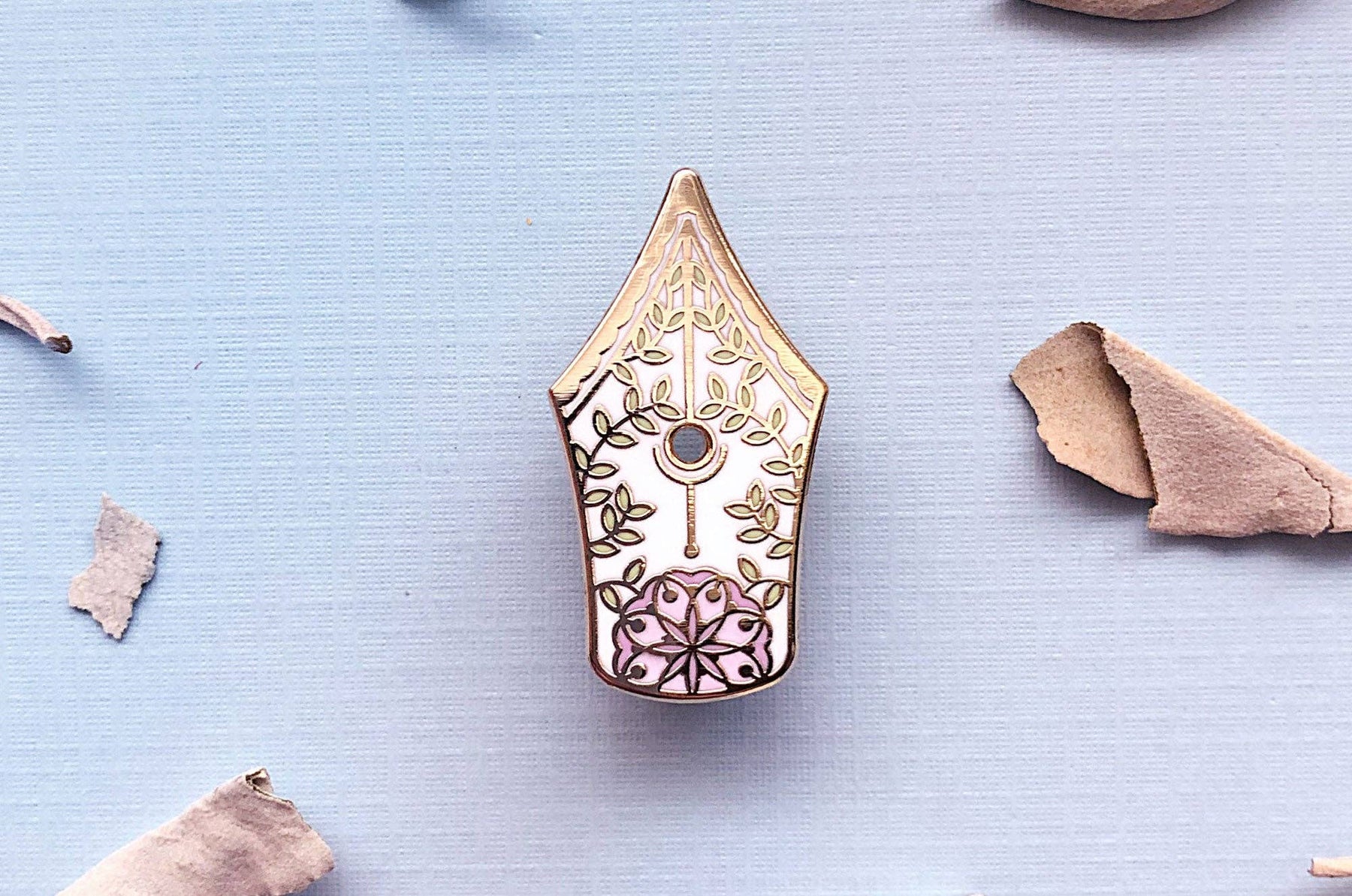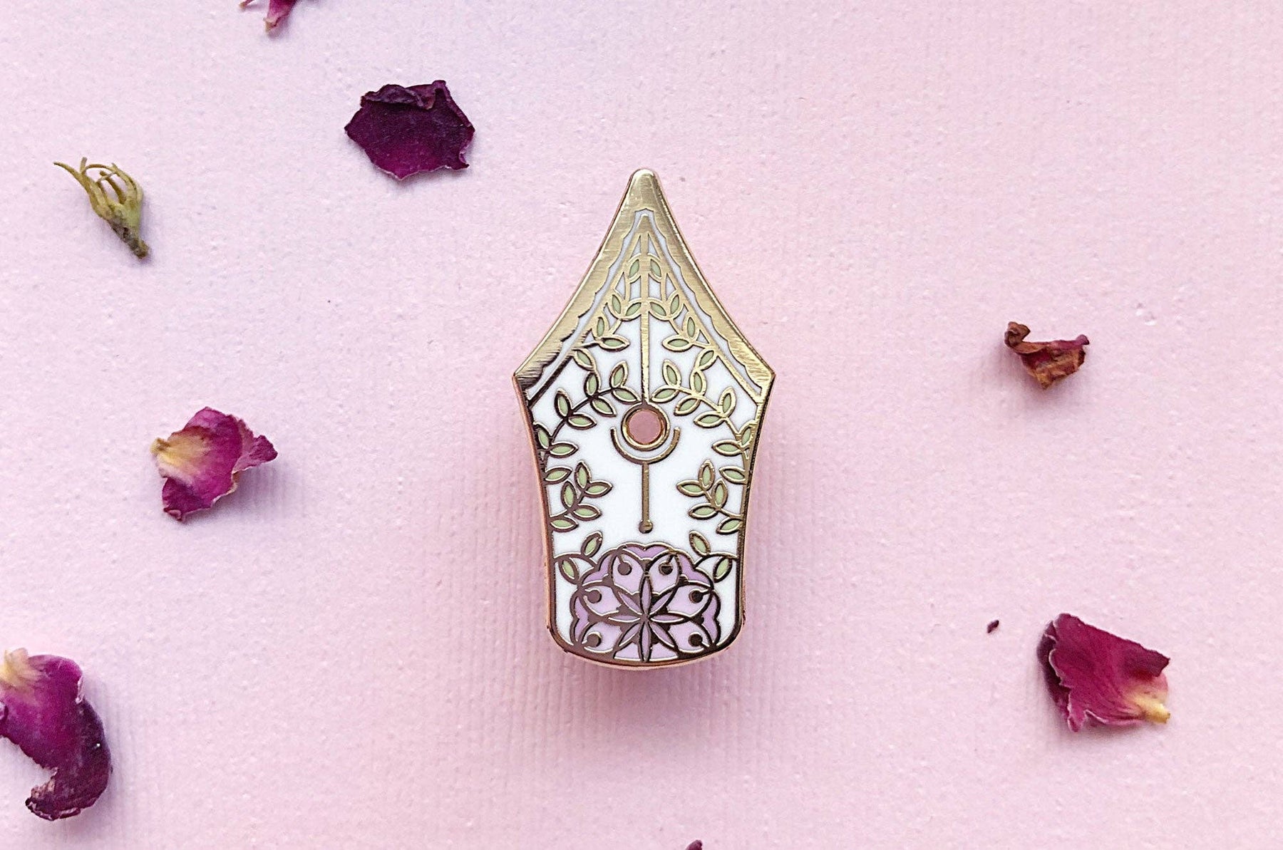 This gorgeous fountain pen enamel pin makes a nice gift for writers, editors, storytellers and fountain pen aficionados. Featuring a leaves and flower design with a circular cut out, this fountain pen pin is 1.25" and uses a white, green and pink color palette. This hard enamel pin is set on a highly-polished gold-plated metal and has two posts on the back. THE FEATURES - Highly polished gold-plated metal. - 1.25″ hard enamel pin. - Has two posts on the back to secure the pin and prevent rotation during wear. - Features white, green and pink colors. - The floral fountain pen illustration is based on my original artwork. - Stamped with "Alum & Ink" on the back. - Comes mounted on a backing card and packed in a protective bag for protection. - Photography props and backdrops not included.