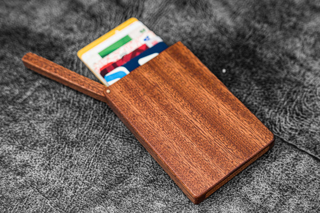 This minimalist business card holder is made with solid Mahogany wood, resawn to approx. 0,078'' (2mm) thick. The Mahogany is a beautiful, rich brown color, enhanced by the swirling grain and the knots.