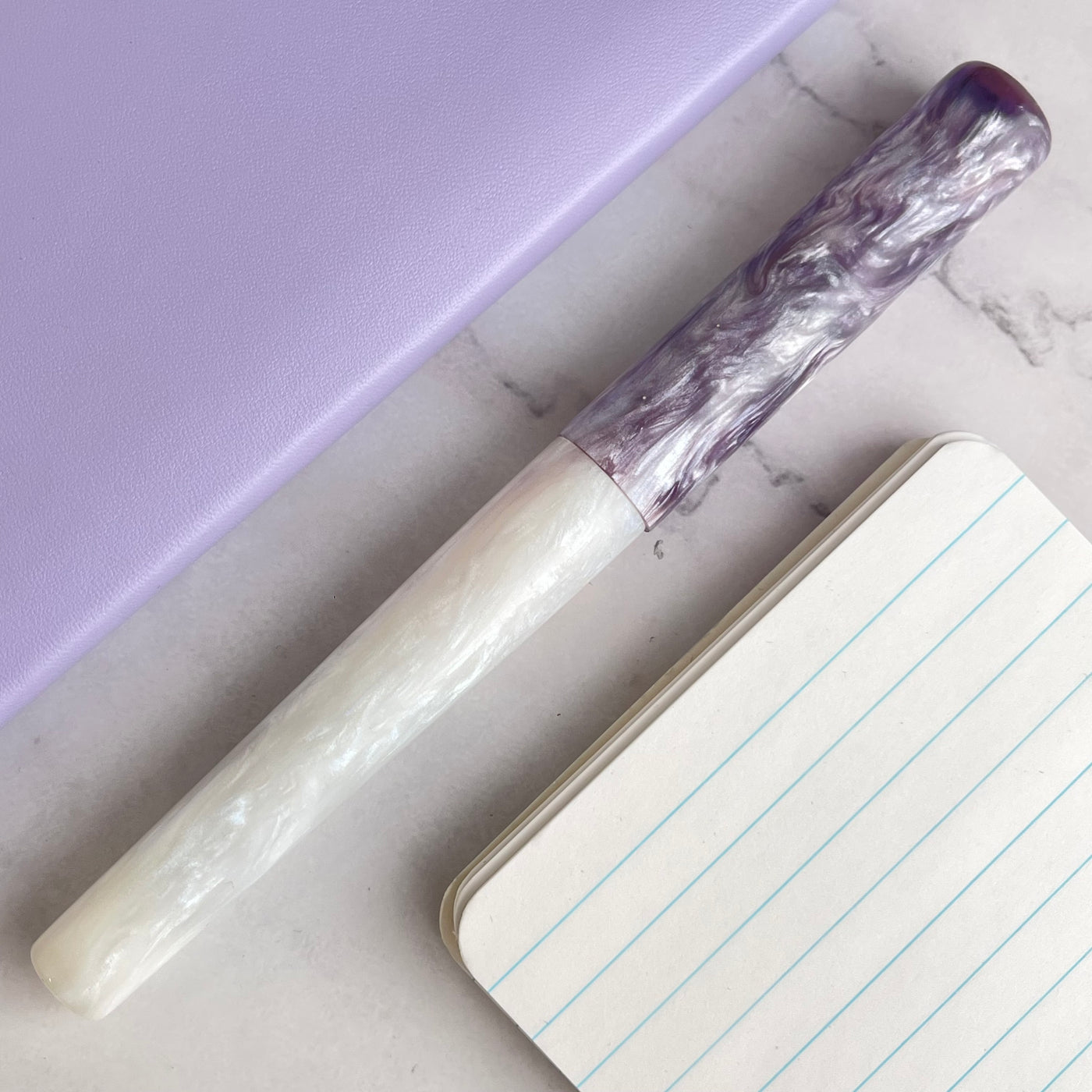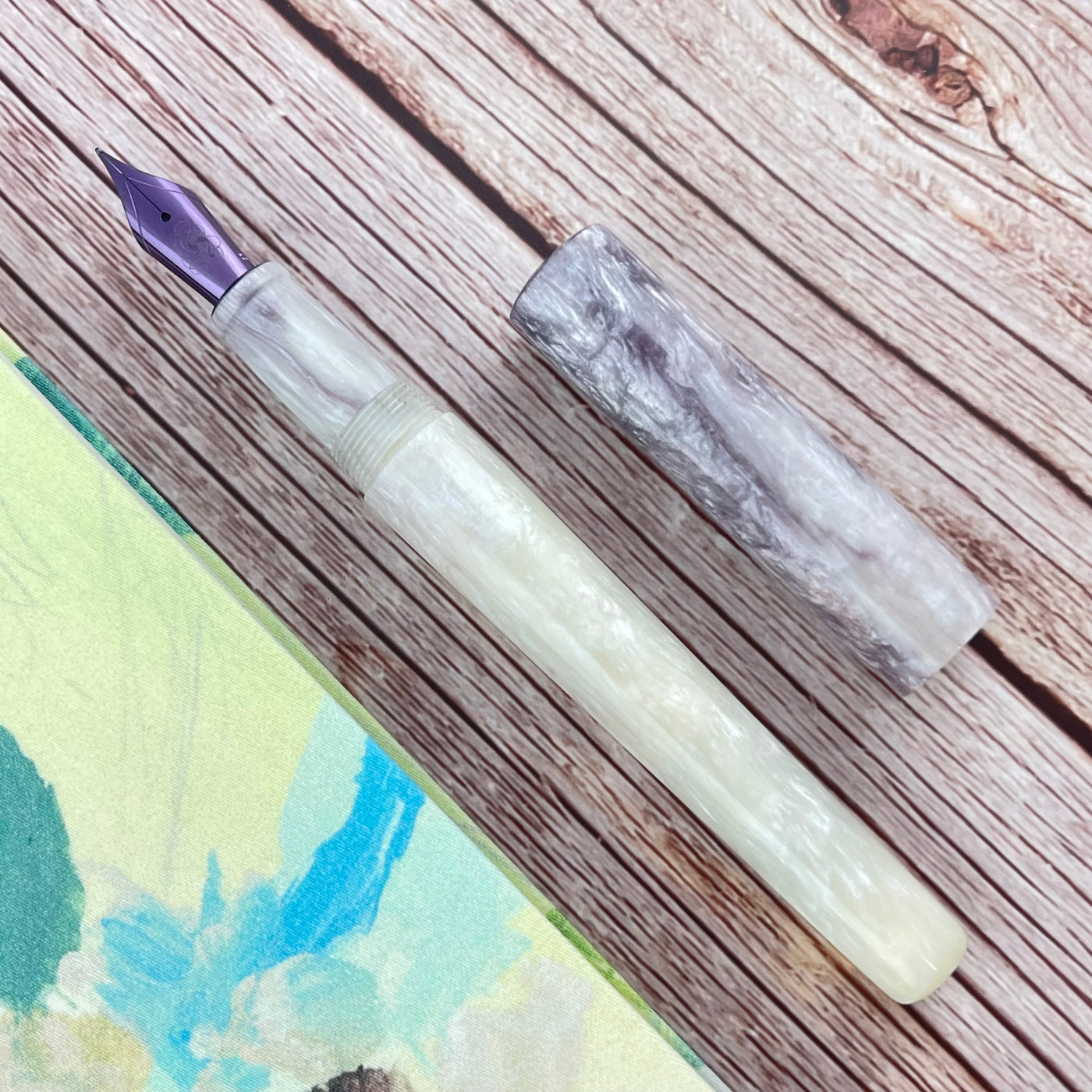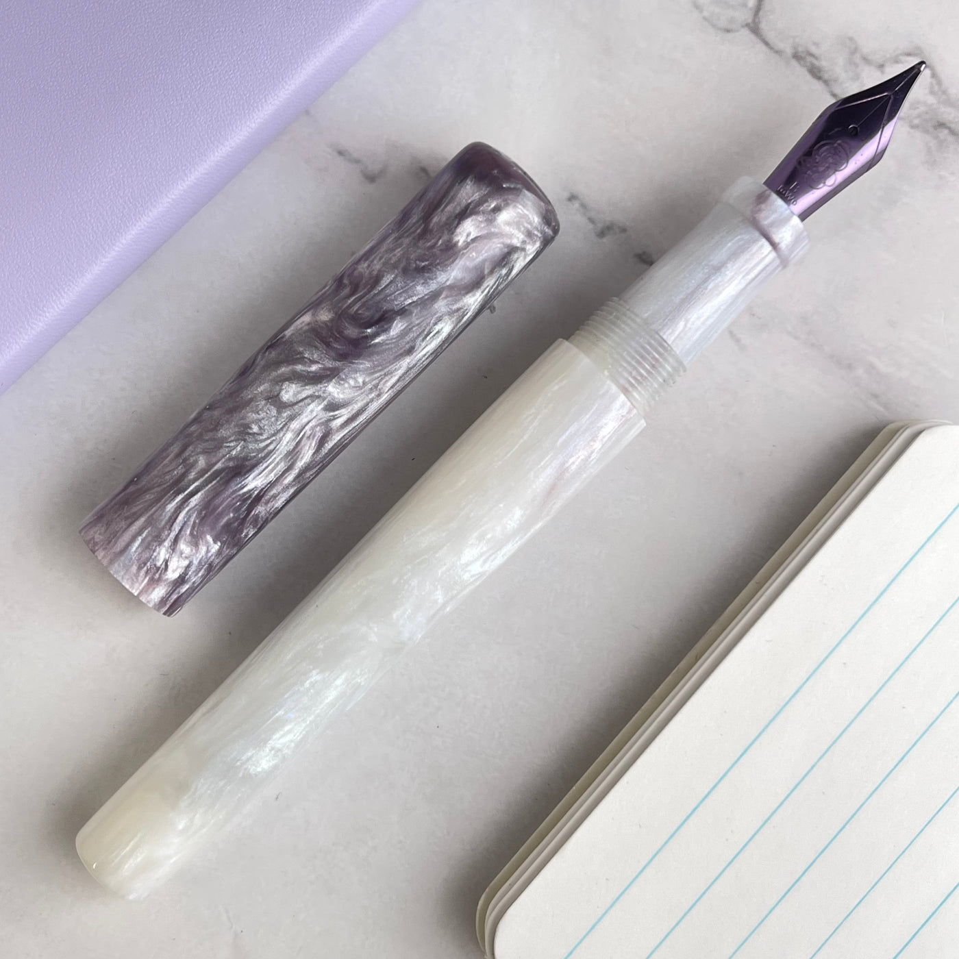 The Magical Mermaid uses what's called interference colors, you can see hints of blue, red, green, and of course purple in the white sparkly diamond. Moving up the body of the pen towards the cap, you see purple magically appear out of that ocean of white, ending with an almost completely purple cap. In the sunlight, the pen glows, much like mother of pearl or abalone shell. Purple has always been associated with magic and sorcery; we feel the pen is aptly named. Of course, the violet nib completes the overall look of the pen. Uncapping it and revealing that beautiful JOWO nib is the true magic and the “WOW” factor for which Hinze is known.