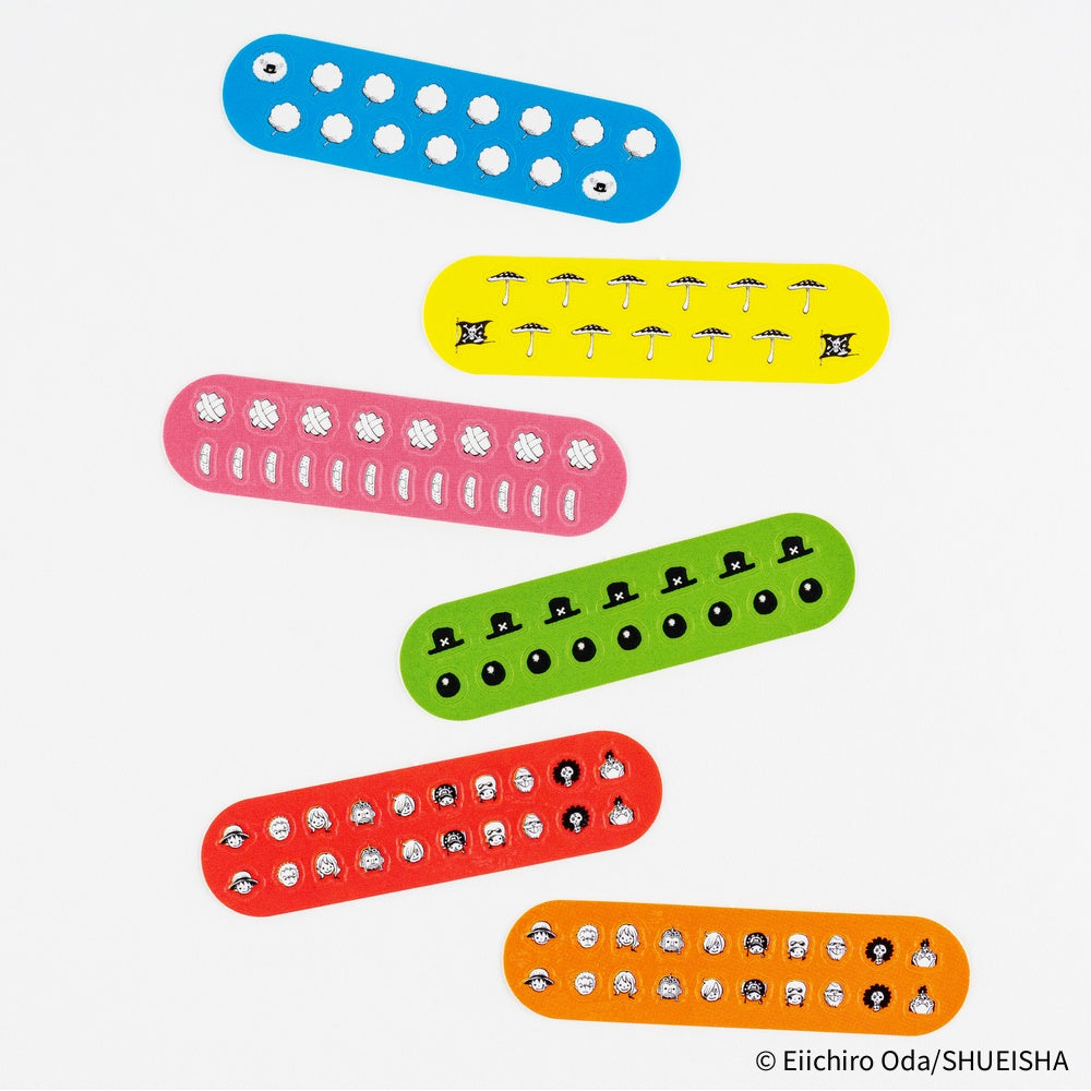 Stickers you can use to cover up mistakes or when there’s nothing to write in your techo. A collaboration design with ONE PIECE magazine. Stickers featuring cotton candy, mushrooms, and the faces of the Straw Hat Crew come in two sizes and are arranged on 12 bandage-shaped sheets. They’re stored in a slider case designed to look like a bandage box.