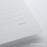 A set of ten lined letter papers. The spacious design with simple ornamentation is yours to fill freely. Choose from classic and refined Conqueror Laid, or Shinkyokushi paper, an everyday paper with the texture of washi paper.