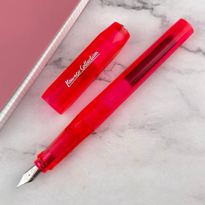 Depending on the light, the exciting color covers a wide spectrum from red to magenta. The light can shine through the translucent plastic and is reflected at the many different angles and edges of the fountain pen. This creates an artistic spectacle of light and shadow. The silver elements also underline the clear character of the pen.