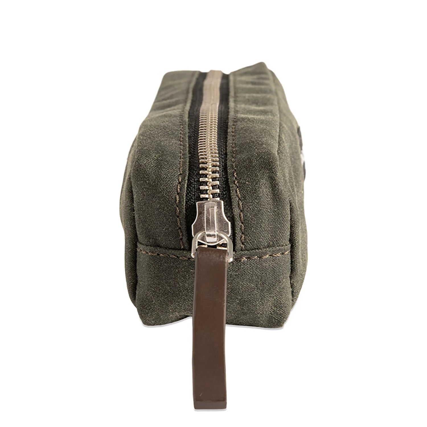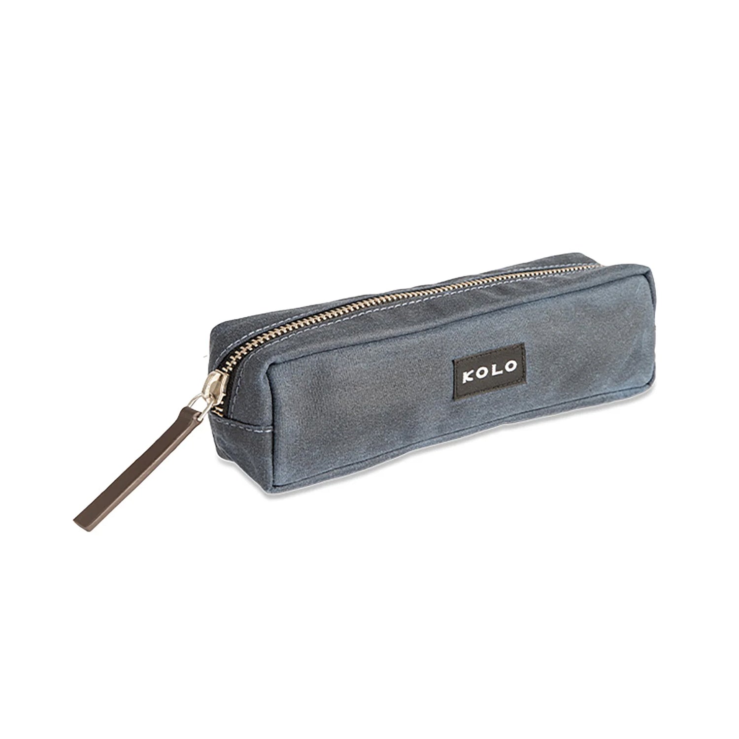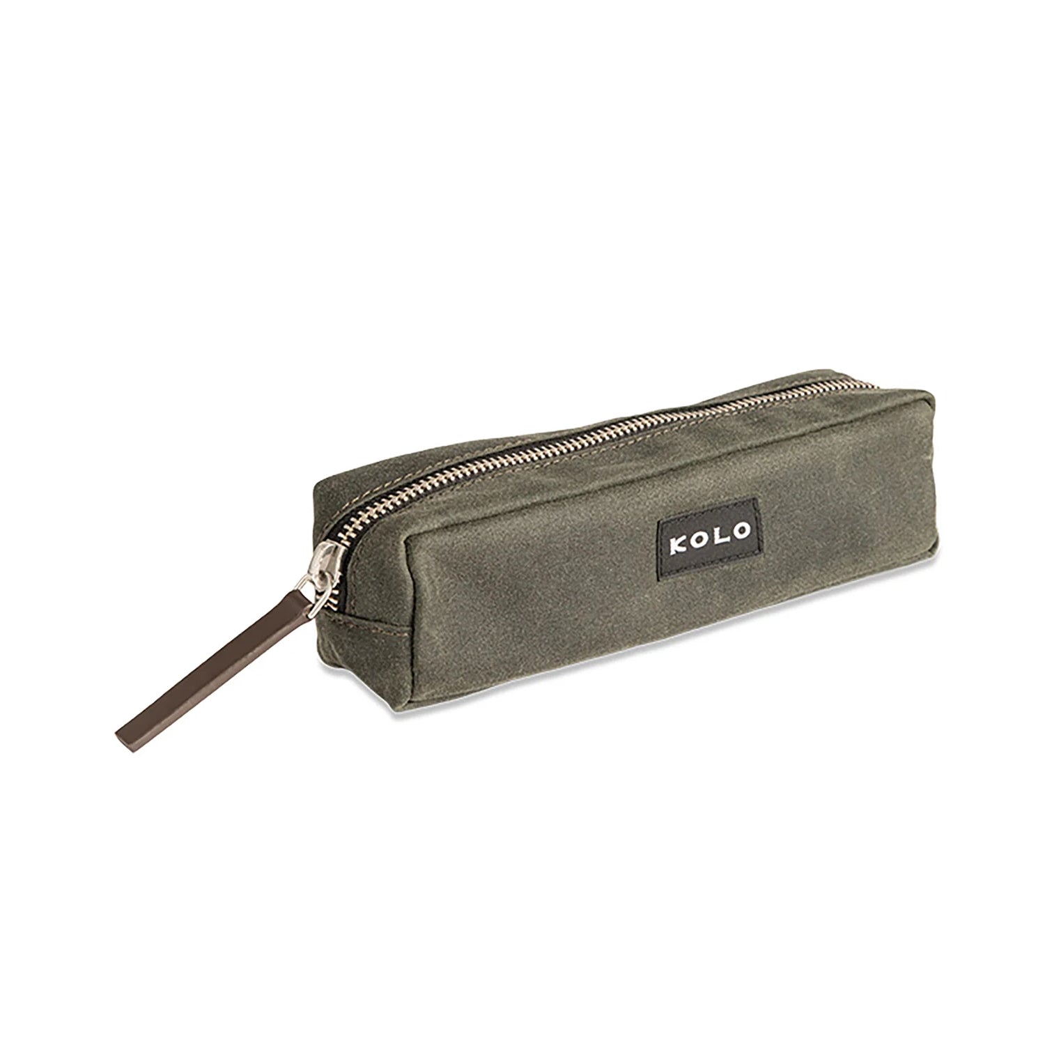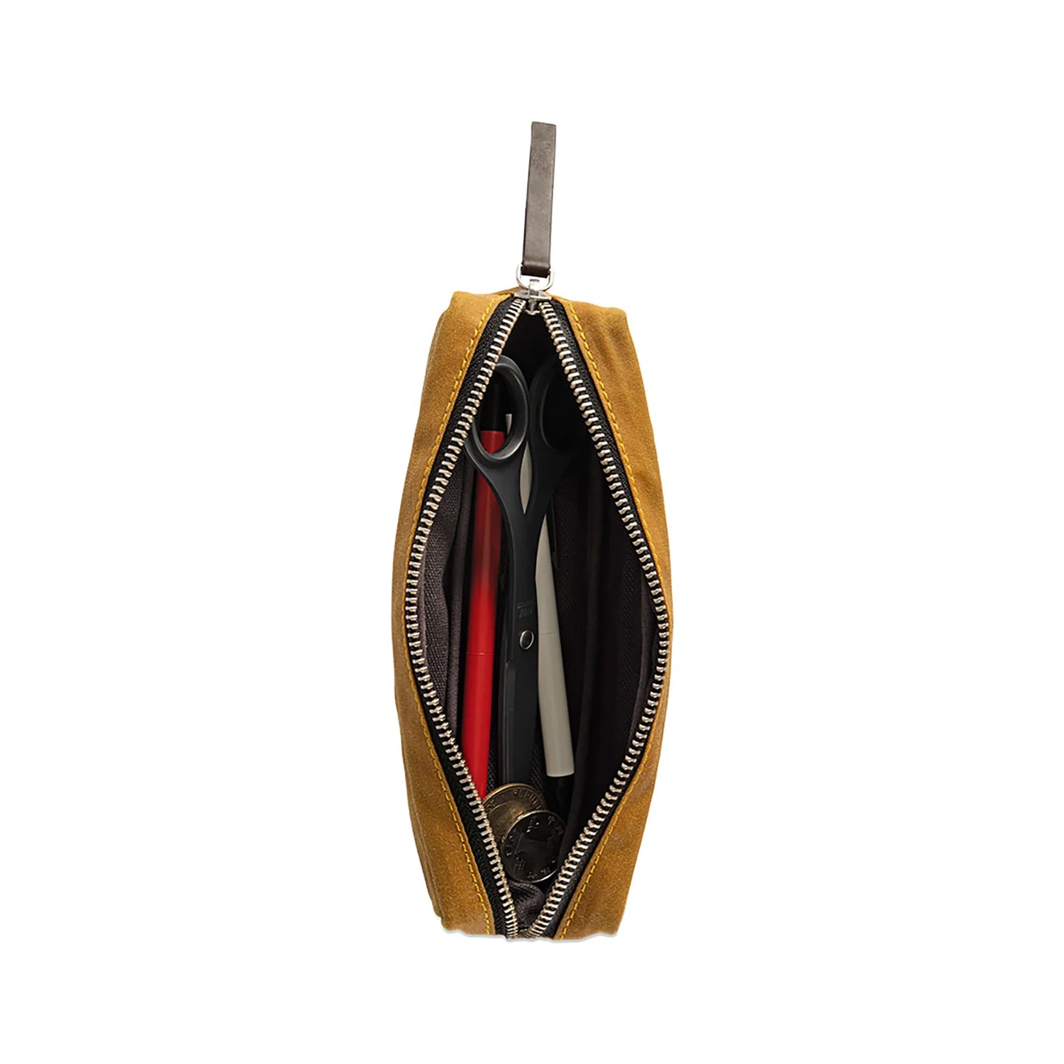 Organic cotton canvas pouch for creative tools. Weatherproof wax coating: durable and stain-resistant. Two-way, solid brass zipper with nickel matte finish. Store pens, pencils, brushes, and erasers for easy carry.