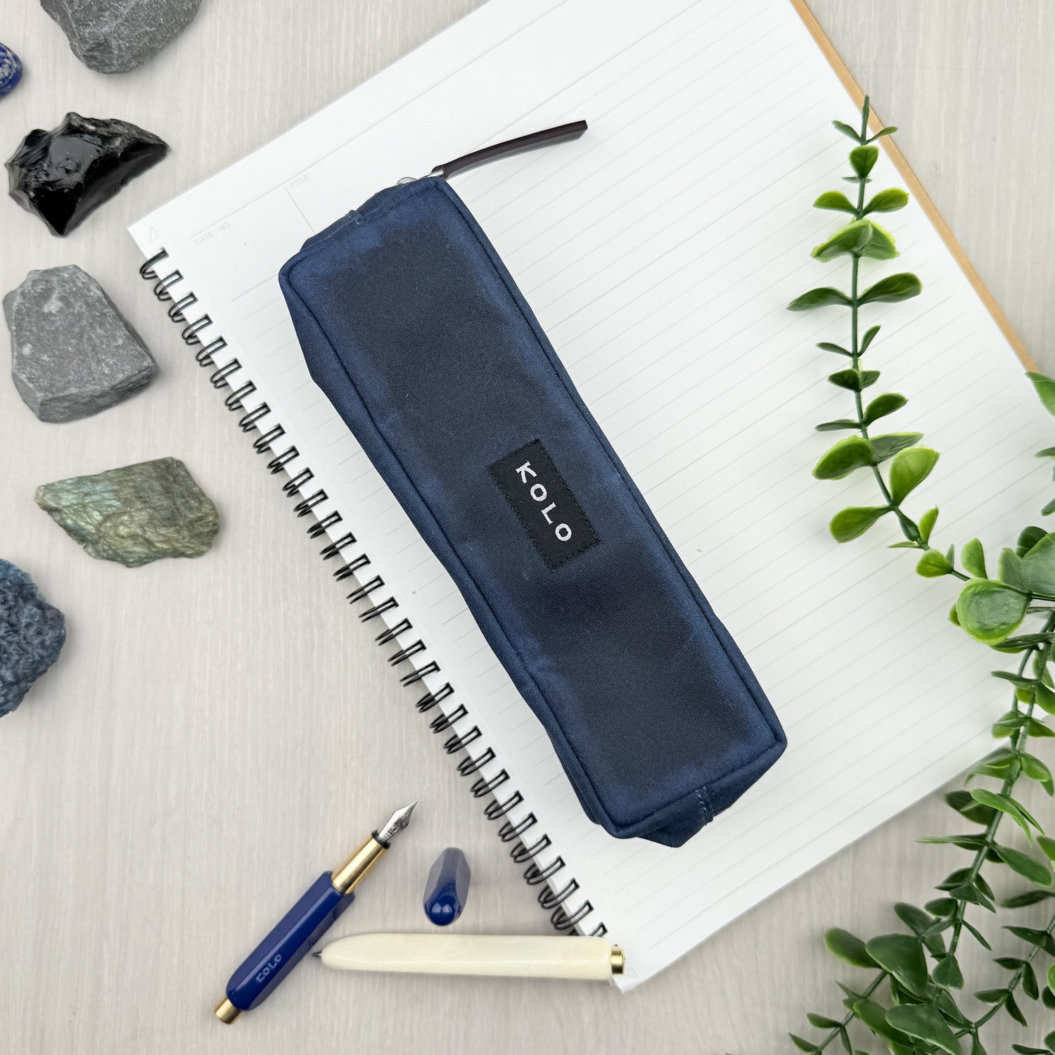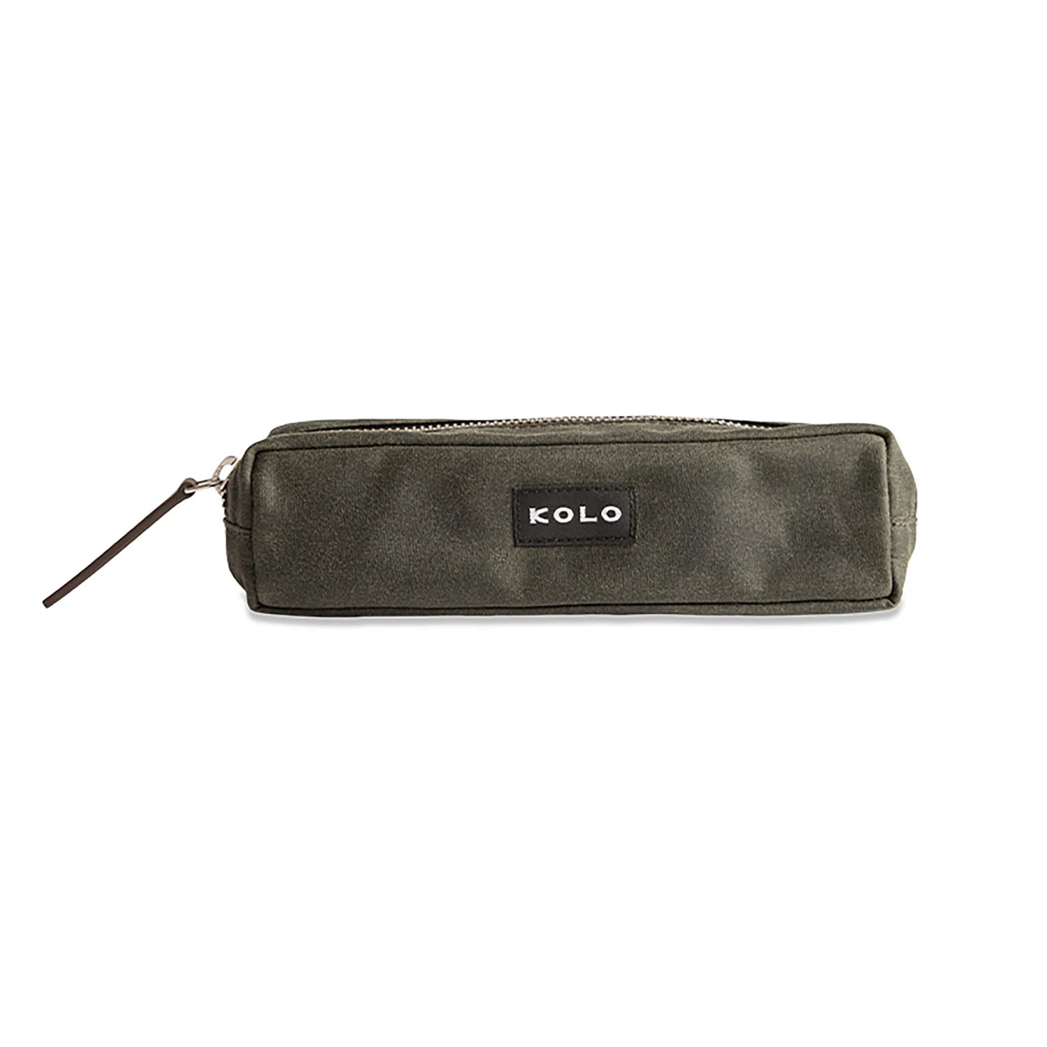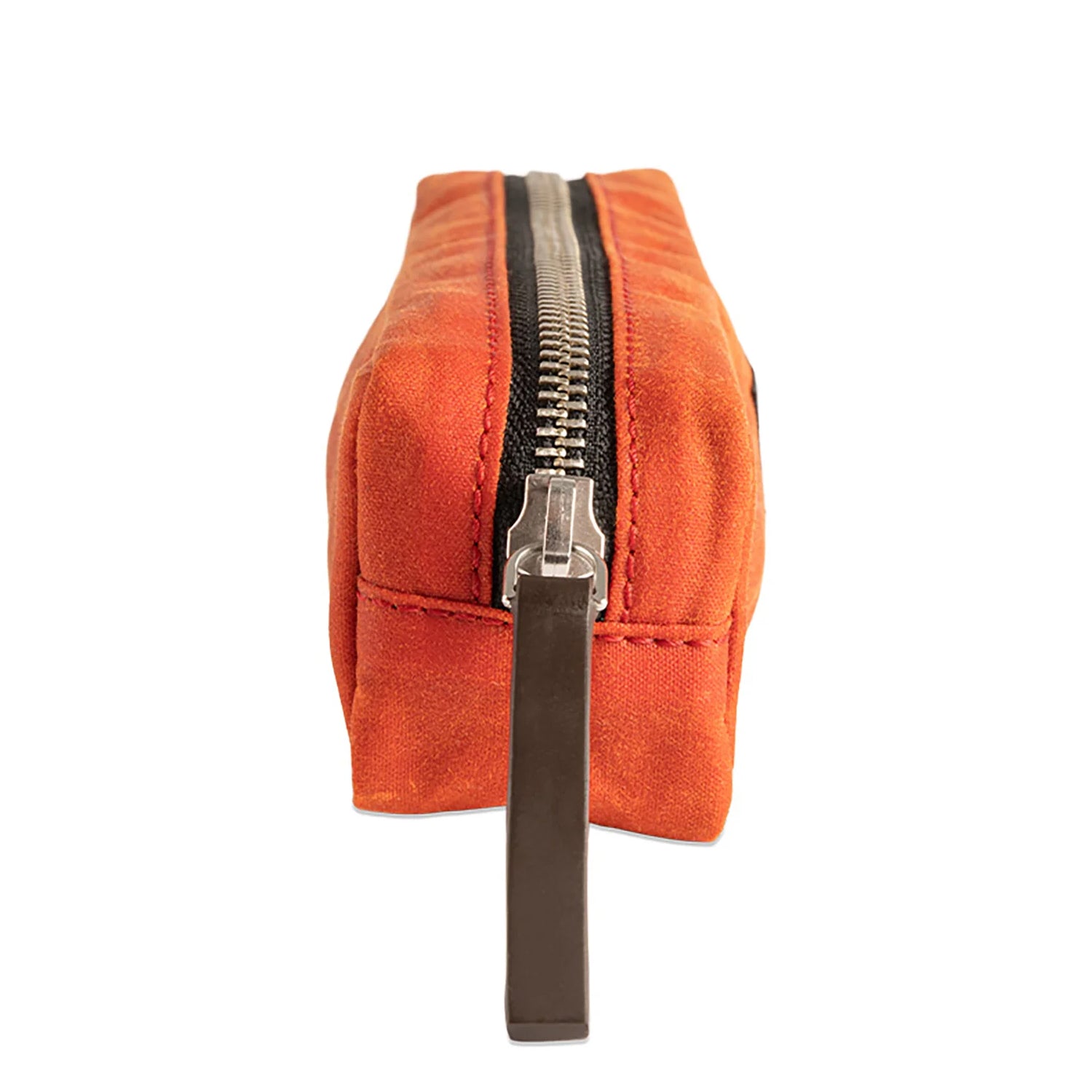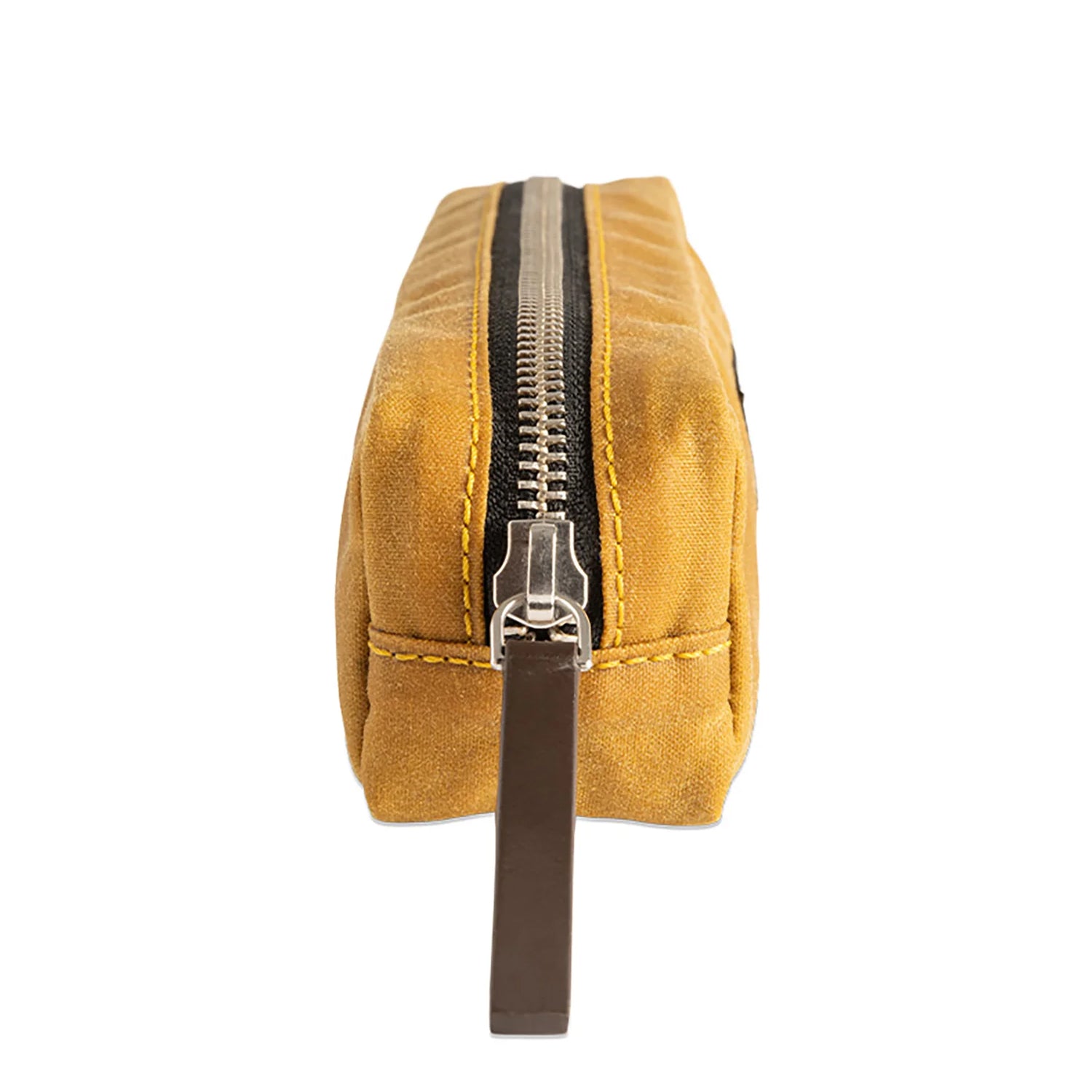Organic cotton canvas pouch for creative tools. Weatherproof wax coating: durable and stain-resistant. Two-way, solid brass zipper with nickel matte finish. Store pens, pencils, brushes, and erasers for easy carry.