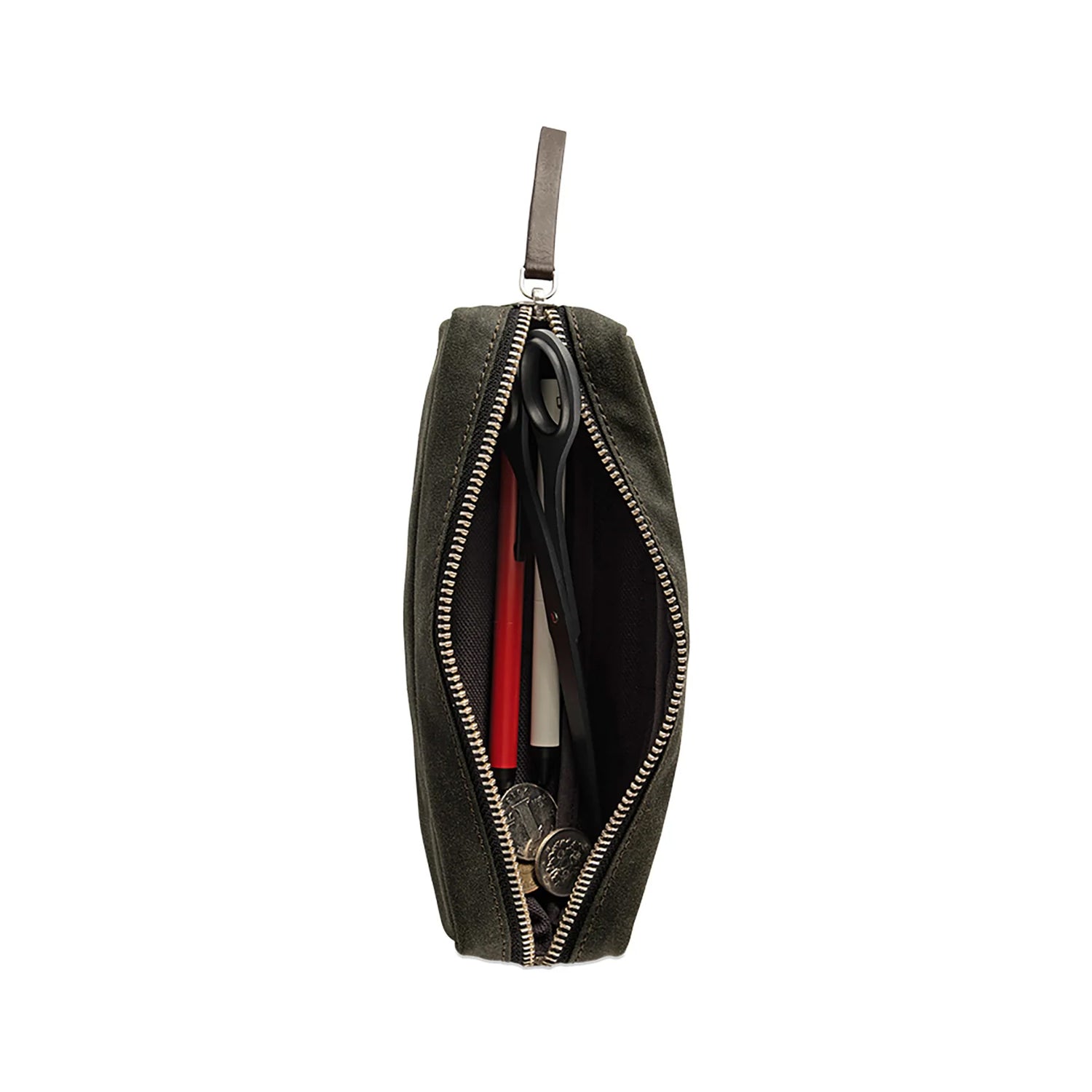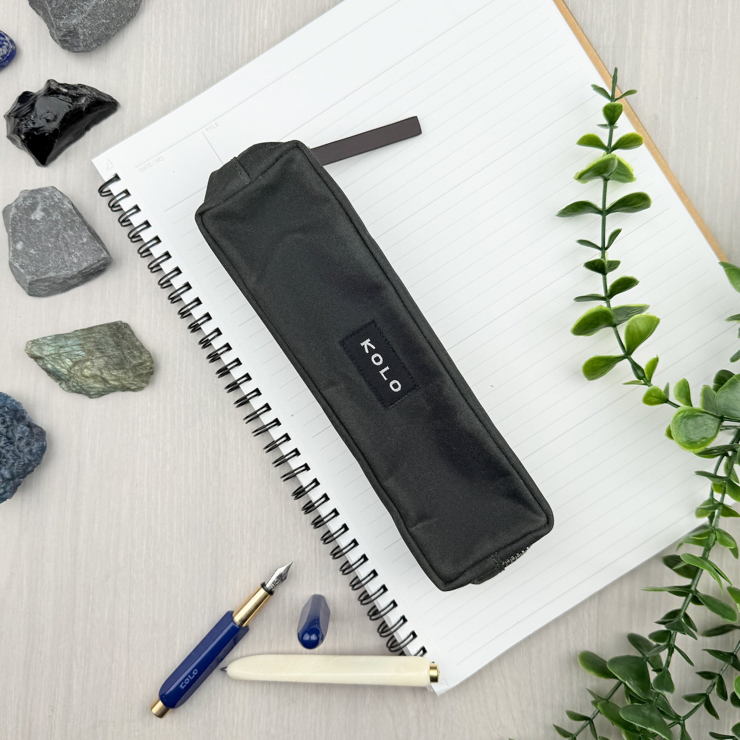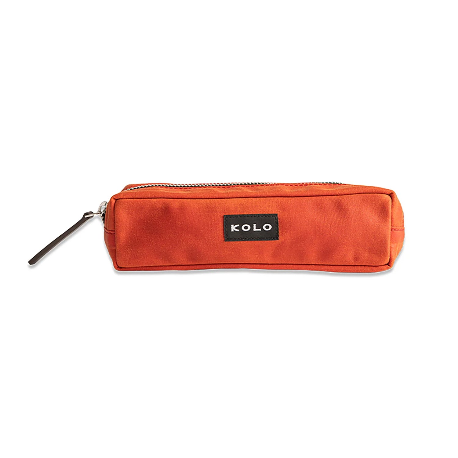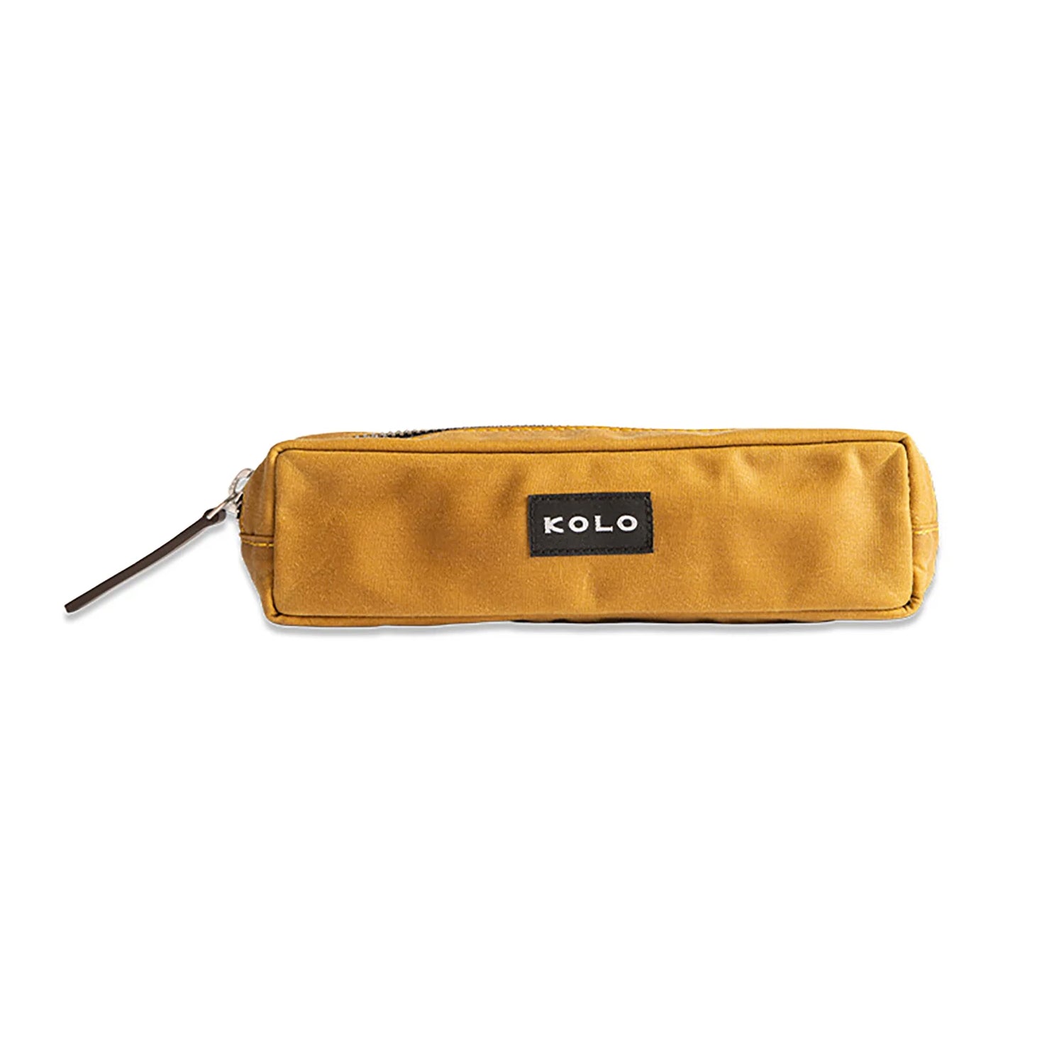 Organic cotton canvas pouch for creative tools. Weatherproof wax coating: durable and stain-resistant. Two-way, solid brass zipper with nickel matte finish. Store pens, pencils, brushes, and erasers for easy carry.