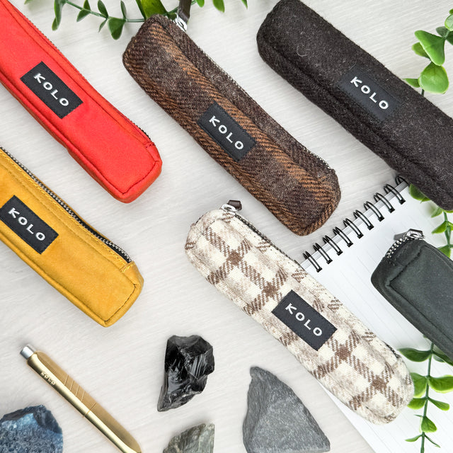 Small pouches for creative tools. Available in wool tweed or organic wax coated cotton.