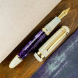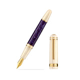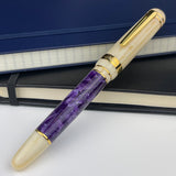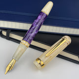 The Laban Wisteria purple Fountain Pen is graciously presented with an ivory and gold trim cap. The body is adorned in a soothing purple acrylic. Gold-tone nib made from rhodium and stainless steel completes this beauty. A dream to write with. A must-have for any pen lover.
