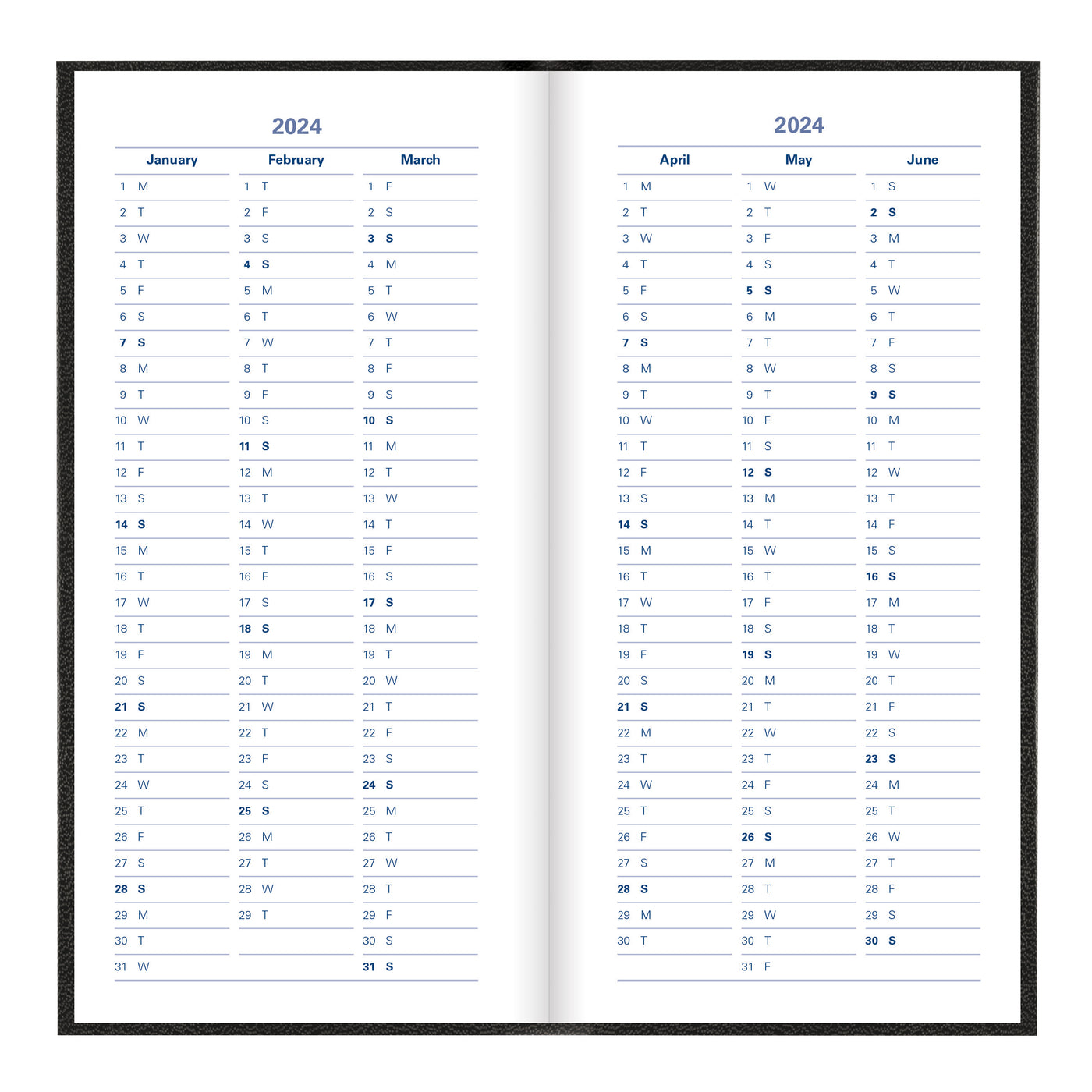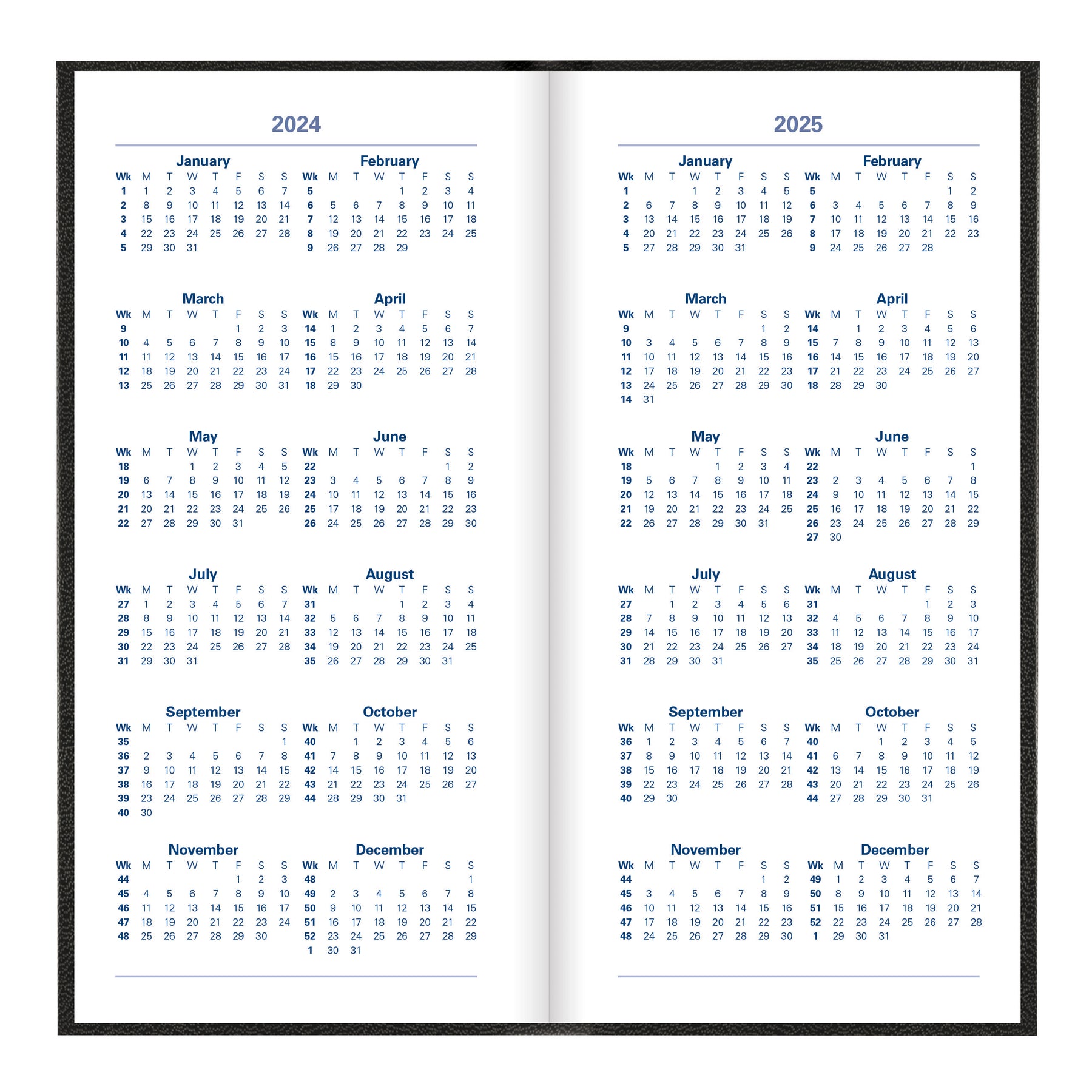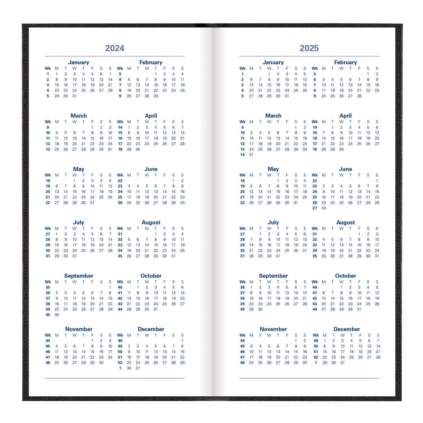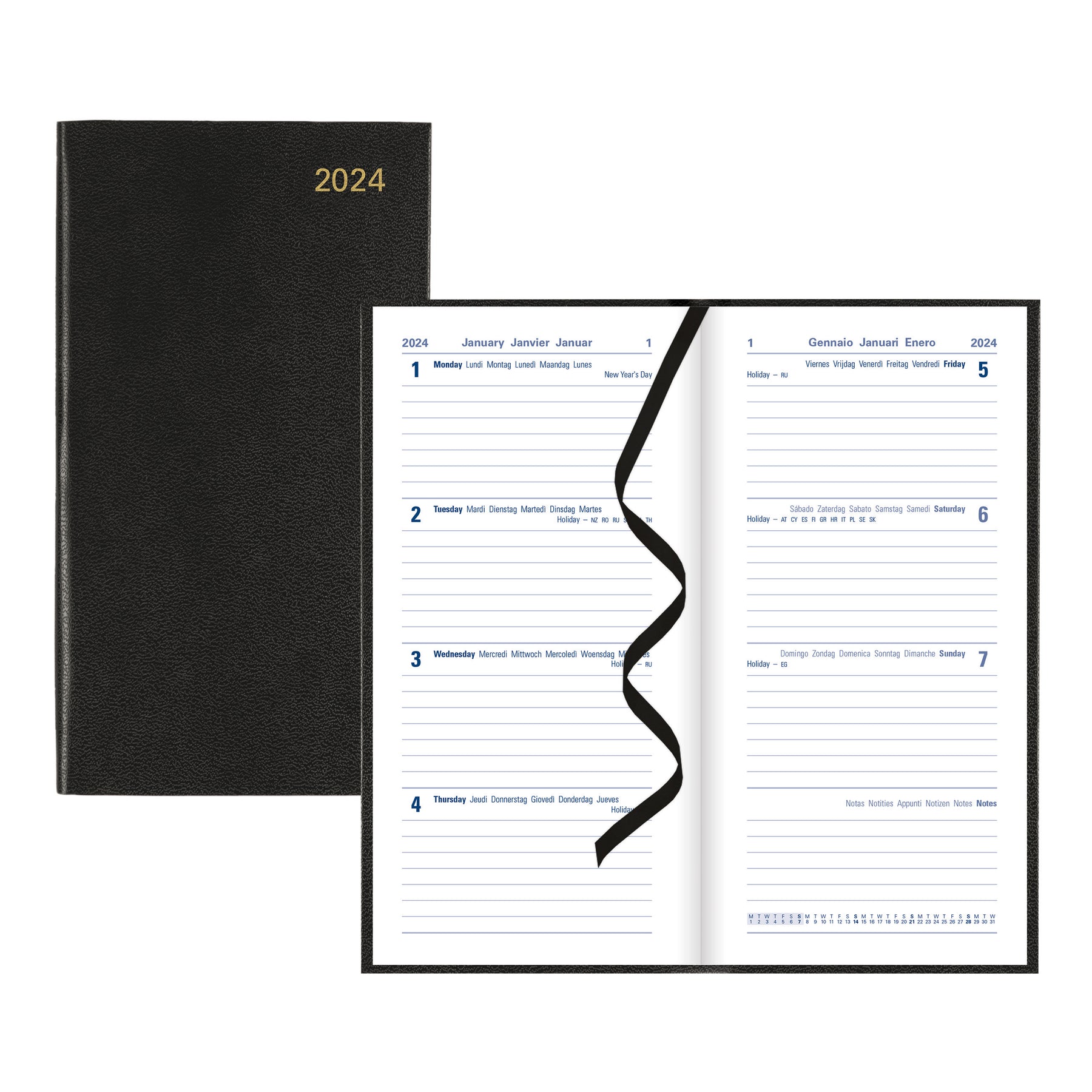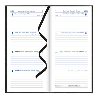 A classic hardback diary with leather-look finish and deluxe foil embossing. Features a week to view diary with ruled space for each day of the week and a calendar of current month on each spread to plan future tasks. Includes a ribbon bookmark, ruled notes section, personal information, holiday symbols, national holidays, religious festivals, conversion tables, French Saints days and time zone map and many more. Multilingual: English, French, German, Italian, Dutch, and Spanish.