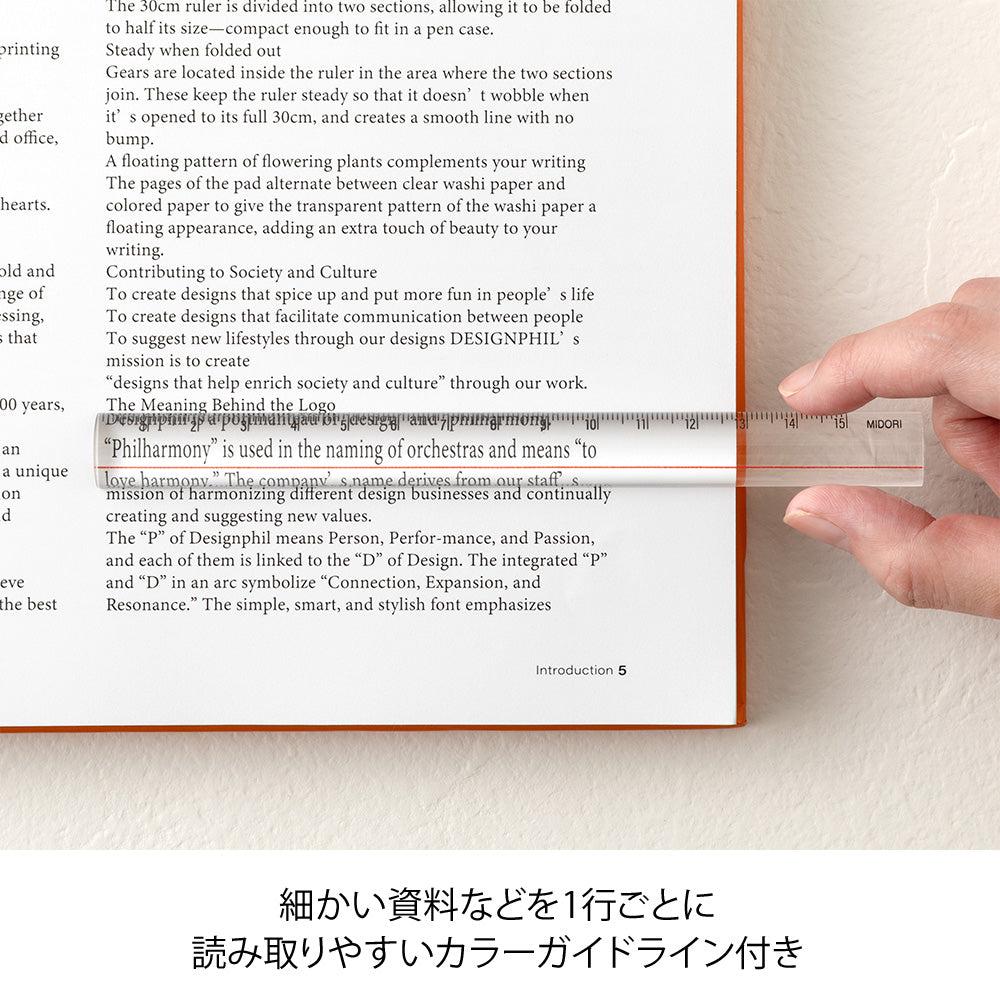 Its compact design allows it to be used not only for drawing lines and measuring, but also as a convenient tool for reading small text more easily than with reading glasses when needed. It includes color guidelines for easy reading along the lines, and the text is magnified by approximately 1.5 times.