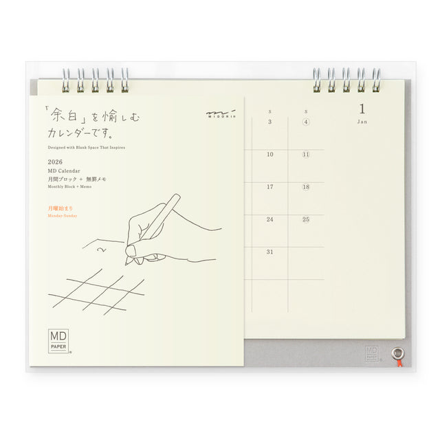 A calendar for everyone who enjoys “blank space”. Following the format of the "MD Notebook Diary," the MD Calendar is a minimalistic calendar combining 12 months of calendar pages with blank pages for notes. It has a simple stand design secured with a single string, allowing you to easily fold it flat or set it upright.