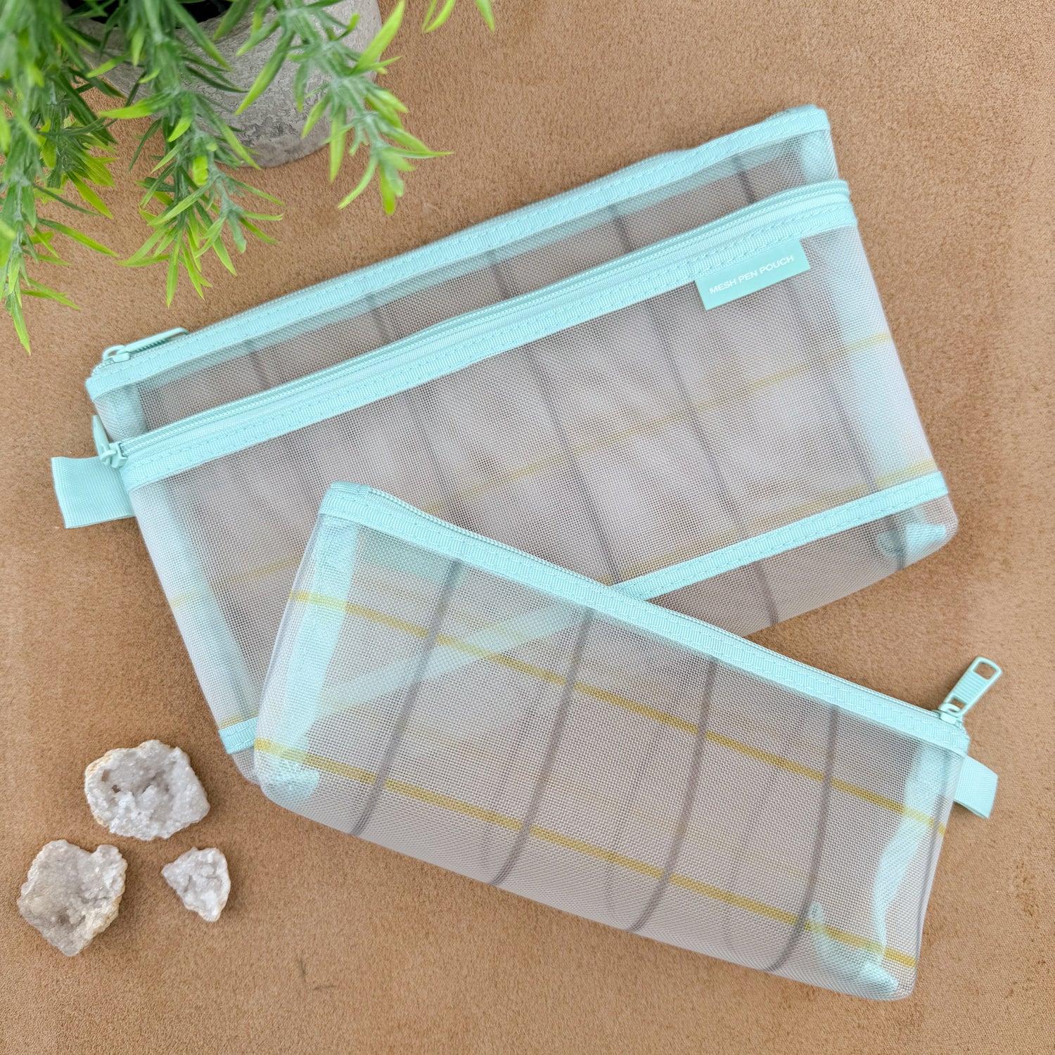 A limited-edition check & stripe design is now available for the pen pouch made from lightweight mesh material, making it easy to see its contents. The gusseted bottom provides excellent storage capacity, and the convenient outer pocket adds extra functionality.