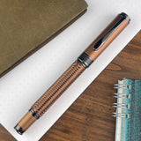 All pens in the collection feature a 304 wire-braided stainless steel sleeve with PVD coating over a brass barrel. Wire braiding is often fitted on high-performance cars as it offers the best possible protection against mechanical damage. The braided mesh is made by winding wire around a core on spools that are rapidly rotated in a circular pattern, weaving the wire together and molding it into a flexible and robust braid. 304 wire-braided mesh’s advantage lays in its incredible durability and resistance against UV rays, abrasion, and chemical corrosion, making it virtually indestructible. Each writing instrument is fully-covered with matte PVD coating, providing key performance features while giving additional vibrancy, luster, and durability.