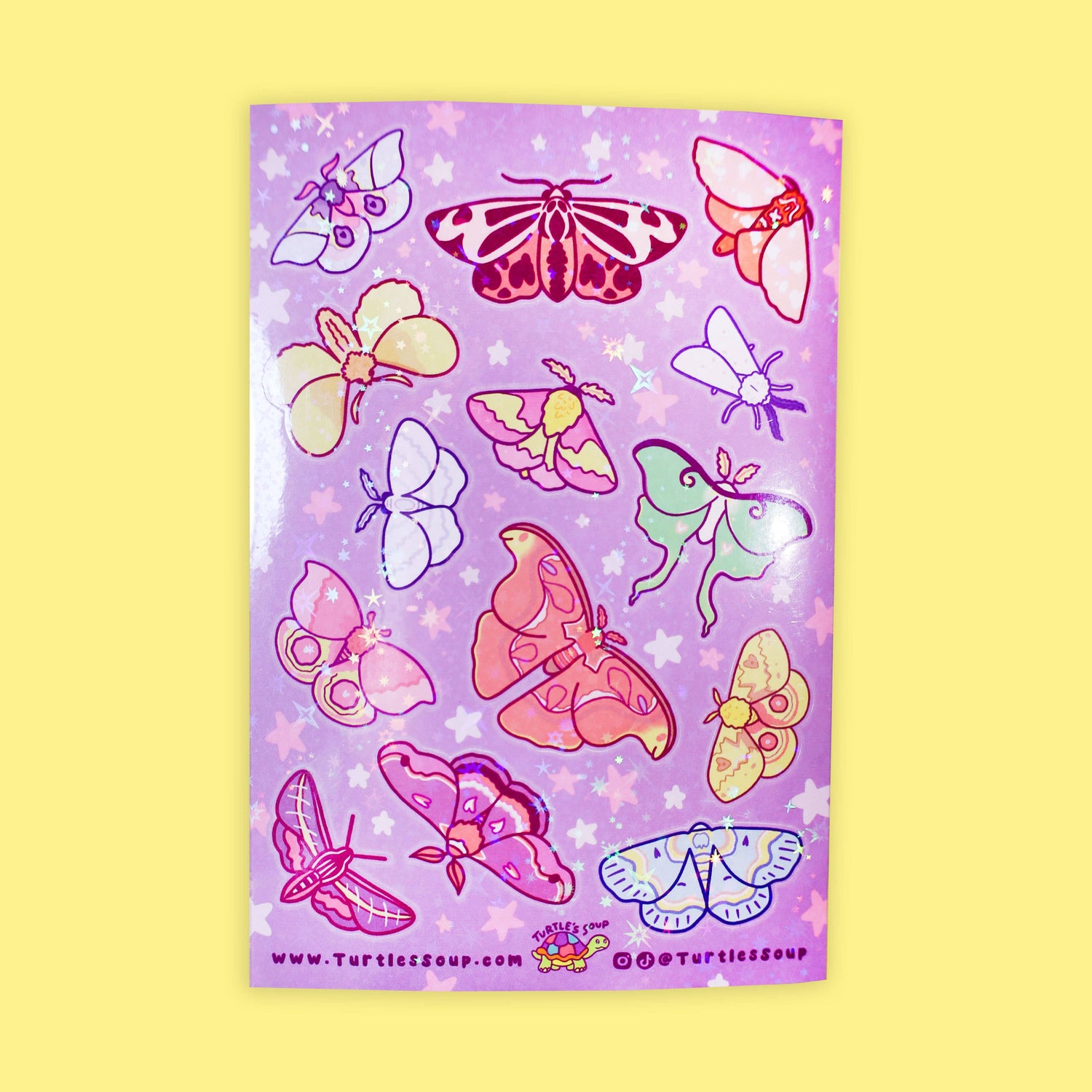 'Moonlight Moths' sticker sheet by Turtle's Soup 🐢 Our Kiss Cut Sticker Sheets are 4 inches by 6 inches and include one (1) sheet per package, with 10 to 20 individual waterproof, vinyl stickers on each. 🐢 Each sheet is enclosed in a sleeve with an art backing card and are retail-ready! 🐢 Stick them on water bottles, laptops, cars, coolers, helmets, skateboards, or just about any flat surface you can think of.